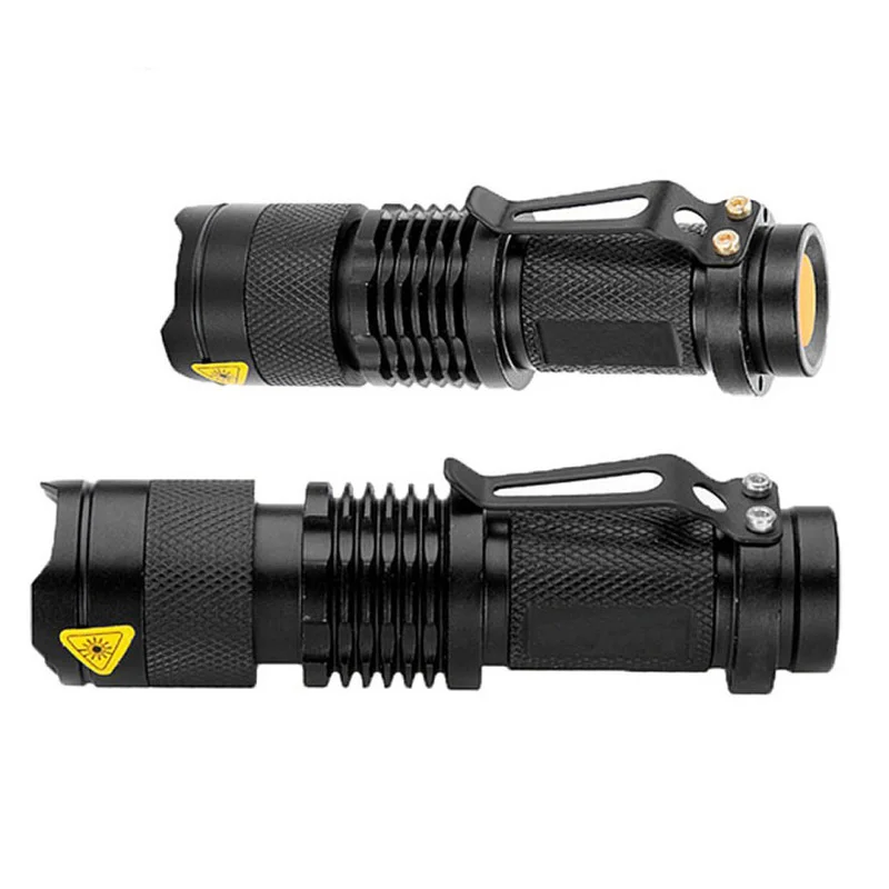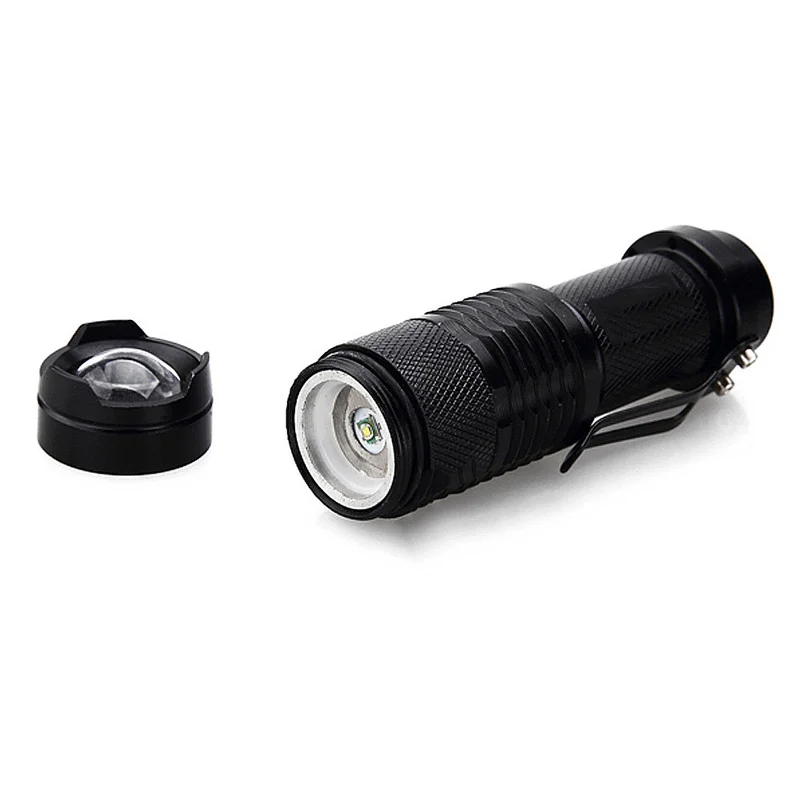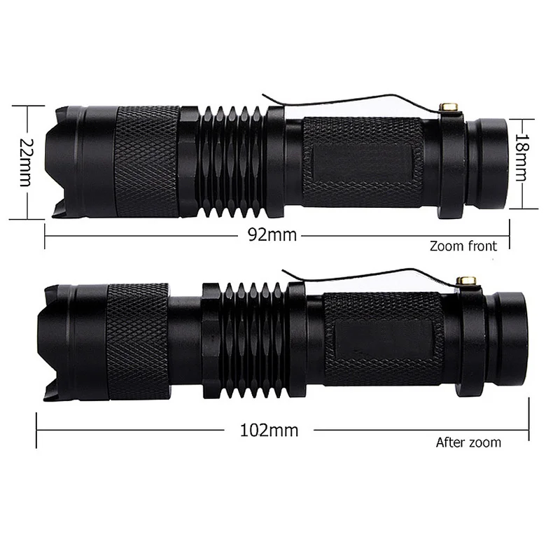 Супер Мини размер, яркий, ослепляющий эффект. Противоскользящий дизайн и водонепроницаемый дизайн. Выходная яркость может достигать 2000 люменов (макс.). Регулируемый диапазон фокусировки для различного использования, растягивается для регулировки фокуса. Зажим для удобной переноски. Рабочее напряжение широкое и может использовать батареи в самой большой степени. Подходит для охоты, велоспорта, альпинизма, кемпинга и активного отдыха и т. д.