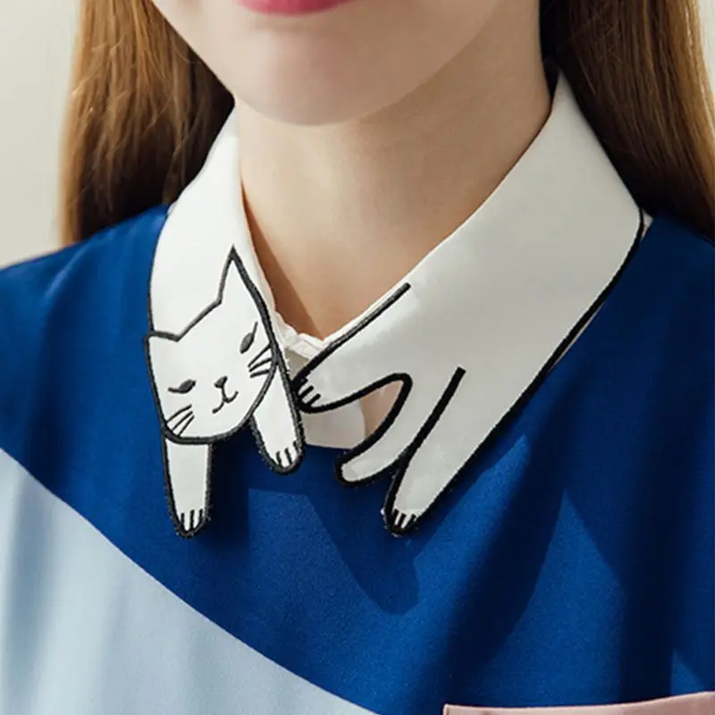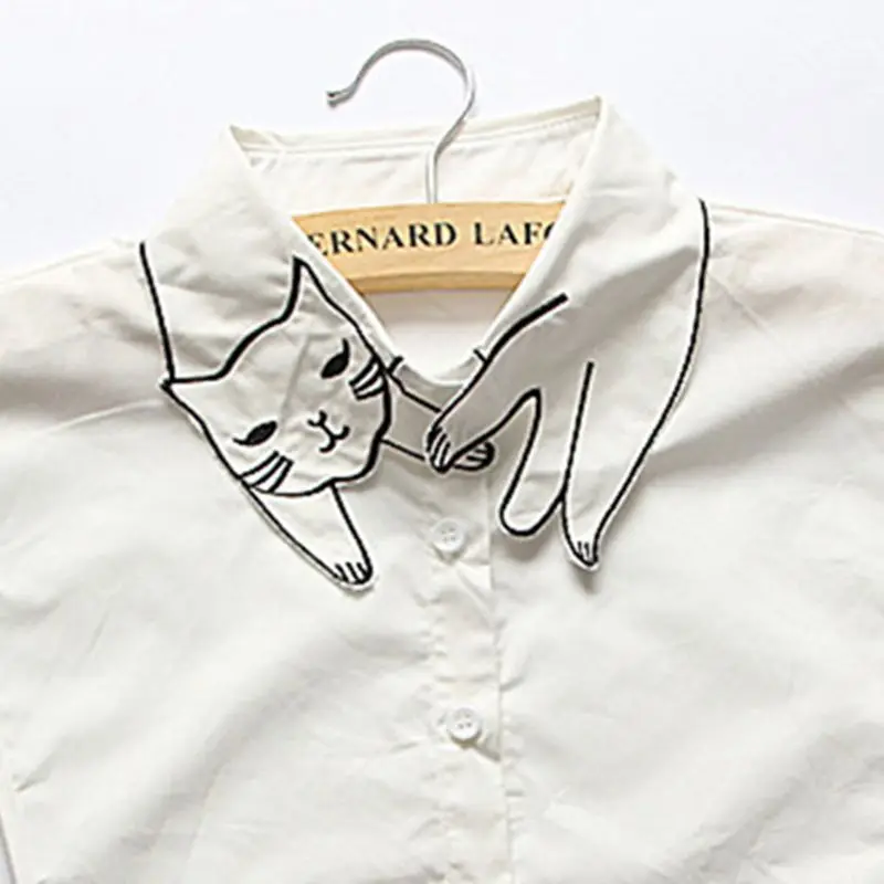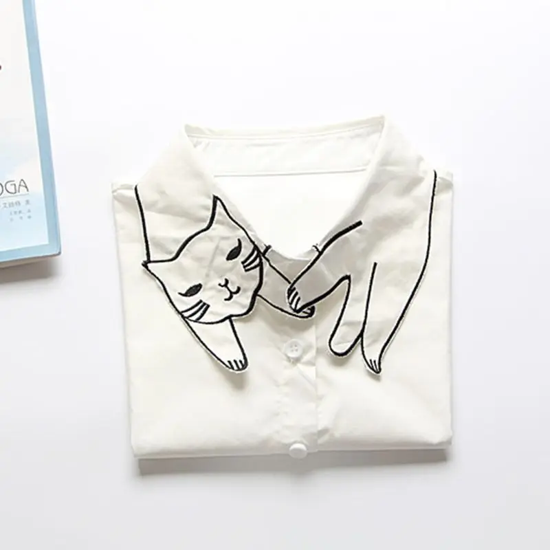 Женская хлопковая блузка в британском ретро-стиле, с ложным воротником и вышивкой в виде мультяшного кота