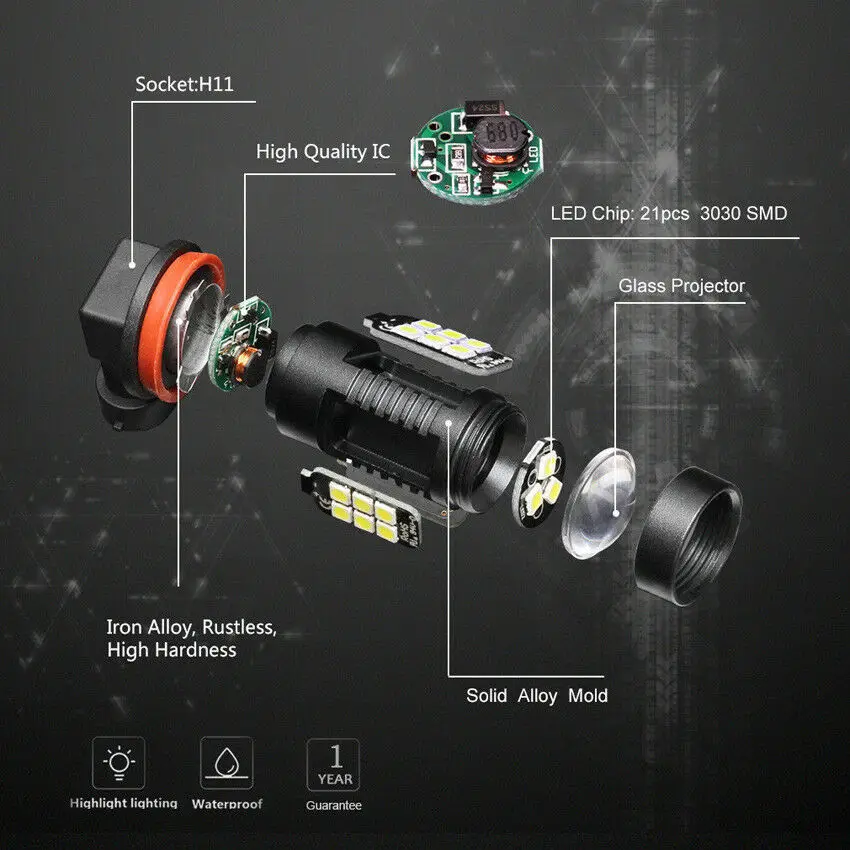 Особенности: 1. Без хлопот установка plug-and-play, подходит прямо в оригинальный светильник корпуса. Покупайте с уверенностью, мы предлагаем гарантию «один год» на товар (ы). 2. Совместимый размер для H11. Напряжение: 12V - 24V (подходит для автомобиля, грузовика, мотоцикла, велосипеда, лодки, других транспортных средств автомобильных RV Авто ....) 3. Пару H11 светодиодный лампы, которые используются для улучшения вашего повседневного использования времени ходовые огни (ДХО) или Противотуманные фары (не подходят для использования с фарами и не имеют функции duel Hi-Low beam). 4. Все-в-одном алюминиевый профиль в качестве теплопроводящей системы, 360 градусов тепла излучение. Водонепроницаемость IP65 позволяет работать в любых погодных условиях. 5. Супер яркий: Каждый светодиодный светильник H11 имеет 21 Индивидуальный Светодиодный чип 3030 с технологией проекции, которая увеличивает плотность и расстояние, чтобы дать вам очень яркий чистый белый светильник на выходе. Описание: Тип чипа светодиодный лампы: 3030 SMD светодиодный чип Светодиодный чип Q'ty для автомобилей: 21 чип Светодиодный светильник для автомобиля: чистый белый Тип гнезда:H11/H8 HB4 9006 HB3 9005 H16(JP) 9012 H10 Напряжение: 12V-24V Теория мощности: 21 Вт на светодиодный светильник Реальная мощность: около 5 Вт на светодиодный светильник Цветовая температура: 6000K Световой поток: 1000-1200лм (Чип на плате) Срок службы: 60000 часов Водонепроницаемость: IP65. Материал: Изготовлен из высококачественного алюминия, который прочен и устойчив к атмосферным воздействиям. Алюминиевый профиль «все в одном» как теплопроводная система, 360 градусов излучение тепла. Использование: используется для обновления дневных ходовых огней (DRLs) или противотуманных фар (не подходит для использования с фарами и не имеет функции дуэли Hi-Low beam) Область применения: автомобиль, грузовик, мотоцикл, лодки, другие транспортные средства