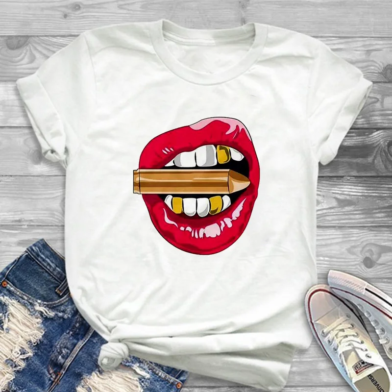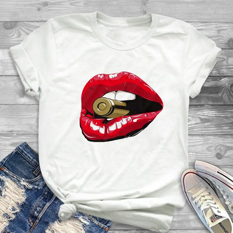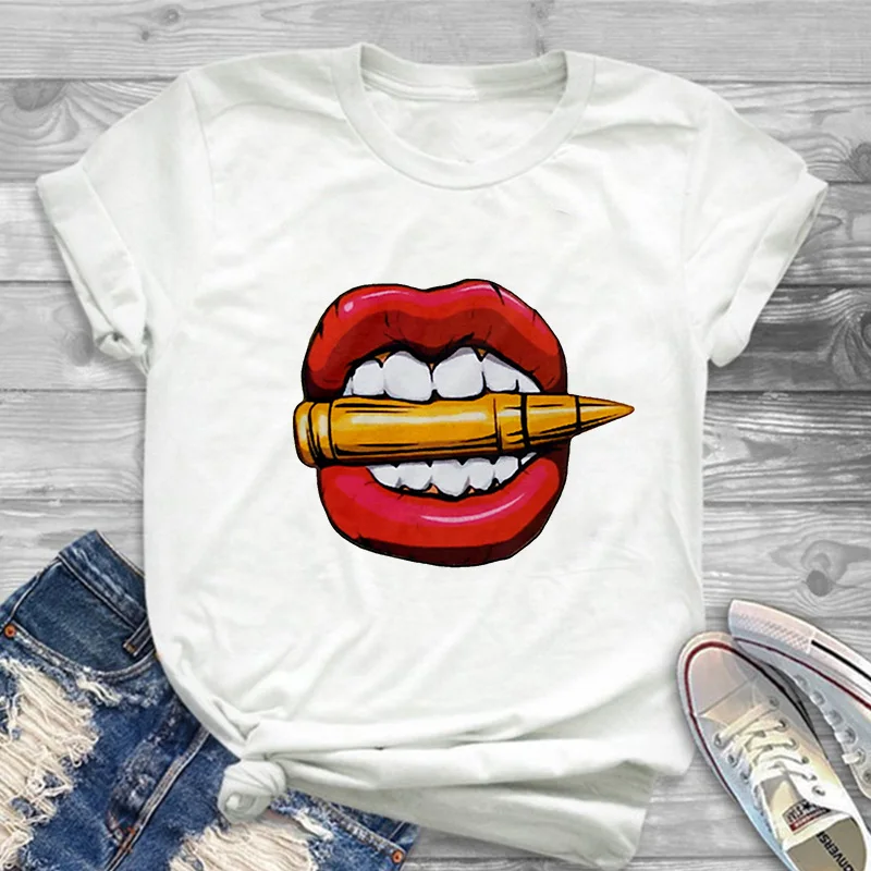 Сексуальные губы, кусающие пулю Футболки с принтом Женская модная одежда с круглым вырезом и коротким рукавом Футболка Harajuku Leisure Белая футболка Топы