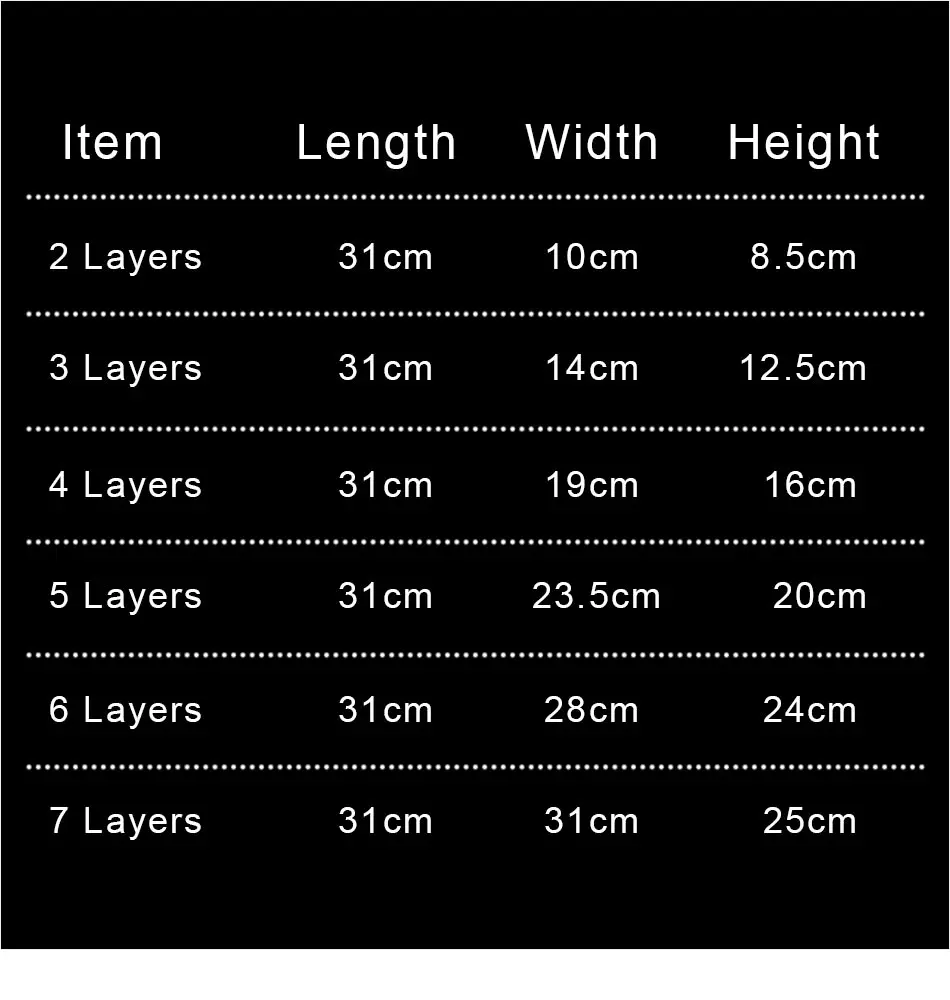 Размер изделия: 2 слоя-длина 31 см * ширина 10 см * Высота 8,5 см 3 слоя-длина 31 см * ширина 14 см * Высота 12,5 см 4 слоя-длина 31 см * ширина 19 см * высота 16 см 5 слоев-длина 31 см * ширина 23,5 см * высота 20 см 6 слоев-длина 31 см * ширина 28 см * высота 24 см 7 слоев-длина 31 см * ширина 31 см * высота 25 см