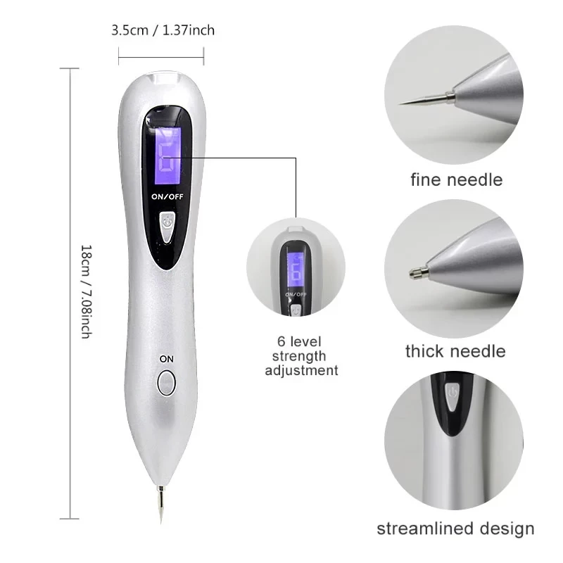 Особенности Используйте новейшие технологии, микрокомпьютерное управление, безопасно, удобно и быстро. Имеет 9 видов интенсивности для разного лечения. Нижний уровень используется на точечных и веснушек. Высокий уровень используется на молях и коже. Удаление пятен без крови. Точечная ручка из нержавеющей стали нетоксична, гигиенична, не ржавеет для безопасного использования. ЖК-дисплей показывает, насколько электричество и уровни интенсивности. Зарядка напрямую через USB-линию, удобство переноски и простота эксплуатации. Аккумулятор большой емкости. Он может работать более 5 часов после зарядки. Спецификация: Тип товара: ручка для удаления пятен Материал: АБС Цвет: Золотой/белый/розовый/серебристый Мощность: 5,5 Вт Напряжение: 3,7 в Вес: 100 г Размер: 3,5*18 см/1,38 * дюйма Руководство по эксплуатации: 1. Кнопка питания (вкл/выкл): Нажмите и удерживайте кнопку (вкл/выкл) в течение 3 секунд, красный светильник загорится после запуска, по умолчанию Уровень 1. Красный светильник для уровней мощности. Он автоматически выключится через 30 минут, если после запуска не будет работать. Дважды быстро нажмите кнопку (вкл/выкл), она покажет текущий уровень заряда батареи, а затем нажмите любую кнопку для возврата (зеленый означает питание). 2. Рабочая кнопка (OUT): Нажмите кнопку (OUT), чтобы начать работу, отпустите кнопку (OUT), чтобы перестать работать (индикатор горит оранжевым цветом). 3. Защитная функция: Нажмите и удерживайте кнопку (OUT) в течение 2 минут, устройство перестанет работать автоматически, если вам нужно продолжить работу, сначала отпустите кнопку (OUT), затем снова нажмите кнопку (OUT), чтобы начать работу. 4. Индикатор заряда аккумулятора и описание заряда: Если горят 3 зеленых светильник почки, это означает 100% заряда батареи; Если горит второй зеленый светильник, то это 75% заряда батареи; Если горит первый зеленый светильник, это означает 50% заряда батареи, когда мигает последний зеленый светильник, заряд батареи становится 25%. При начале зарядки эта ручка для удаления родинок автоматически выключится и перестанет работать, по очереди будут указаны 3 зеленых огня. Когда все 3 зеленых Лампочки горят и больше не меняются, это означает, что зарядка завершена. Комплектация: Ручка * 1 USB-кабель * 1 Толстые иглы * 1 Тонкие иглы * 5 Руководство пользователя (на английском языке) * 1