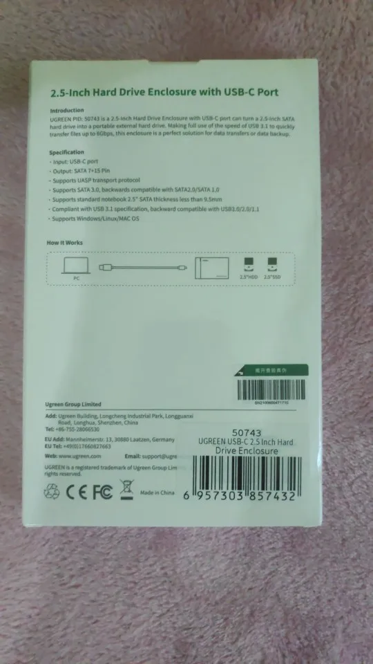 Кейс для SSD просто отличный, приятно держать в руках, диск внутри держится очень жестко, работает через USB отлично. Вообще товары марки Ugreen очень качественные. Молодцы. Спасибо продавцу. Отправил быстро. Только, шло долго. Но, думаю это из-за праздников в КНР.