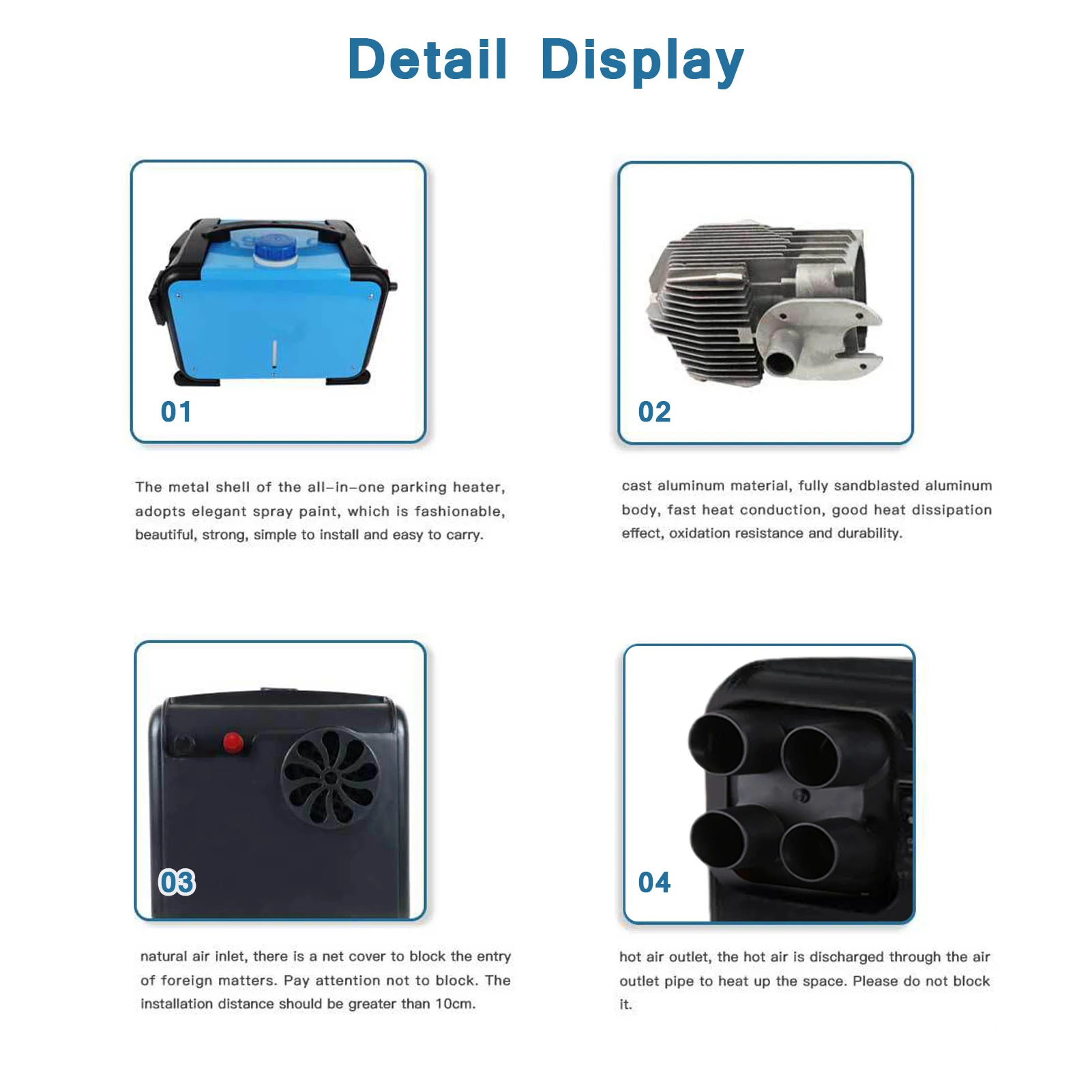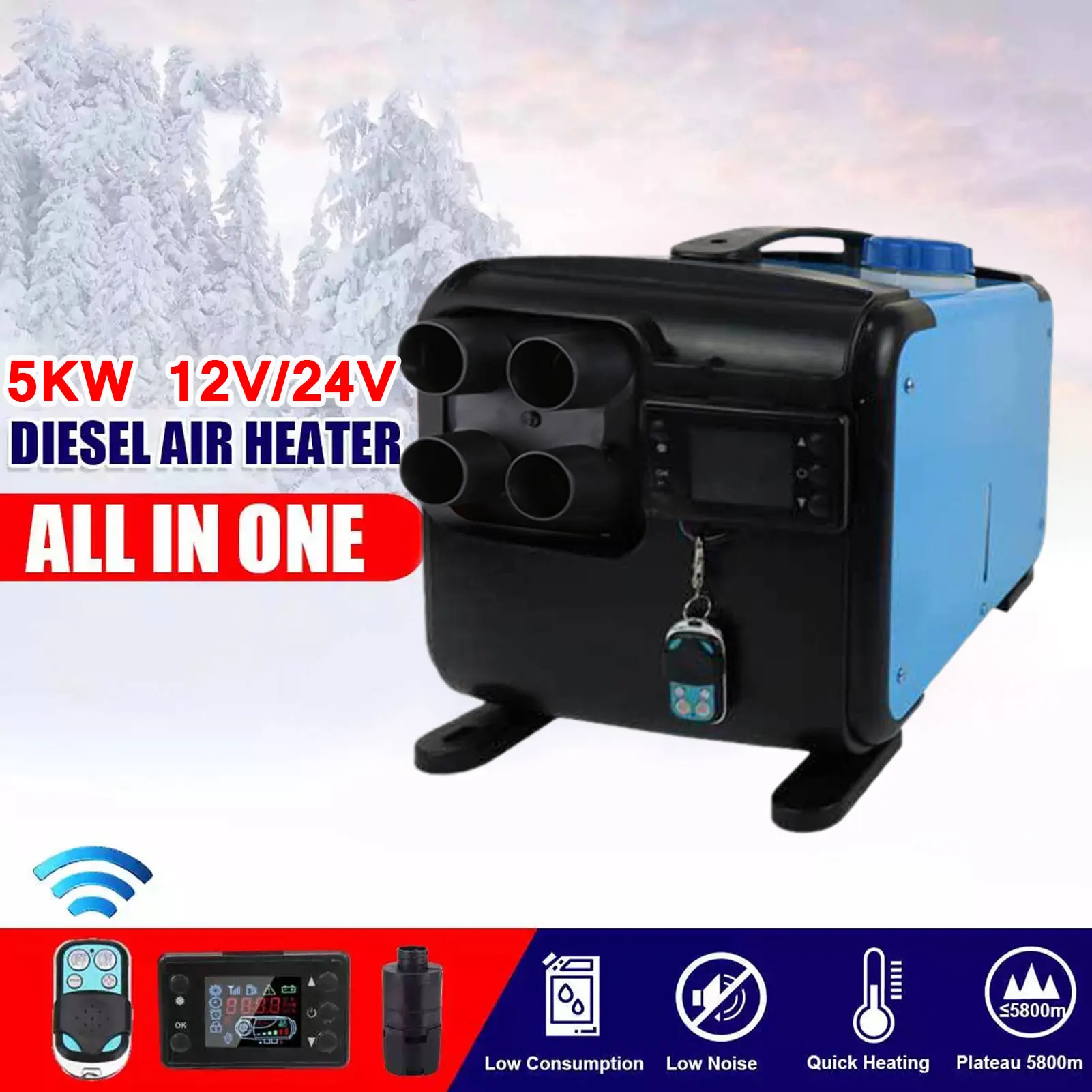 Особенности:Мощность может регулироваться в диапазоне от 1 кВт до 5 кВт для удовлетворения различных потребностей.Может использоваться в высотных помещениях на расстоянии до 4500 метров над уровнем моря.Все в одном, экономит место и легко перемещается.Легко устанавливается и снимается, а также прост в обслуживании.Избегайте повреждения автомобиля, вызванного резким перепадом температуры.Низкий уровень шума и полезность.Простота установки: компактный дизайн подходит для использования в различных узких помещениях.Низкий расход топлива и энергопотребление могут продлить время работы нагревателя.Комнатная температура автоматически контролируется путем установки заданной температуры.С системой мониторинга и непрерывной диагностики.Топливо из автомобильного бака.Применим к различным дизельным машинам транспортных средств, таких как автомобили, автобусы, рекреационные транспортные средства, грузовики, инженерные транспортные средства и т. Д.Технические характеристики:Название: 4 Отверстия 12 в 5 кВт дизельный воздушный обогревательМатериал: металл + пластикРазмер: около 40*30*26 см/15,75*11,81*10,24 дюймаНапряжение: 12 В/24 ВМощность: 1KW-5KWТопливо: дизельное топливоПолный коэффициент горения: 100%Расход: 0,1 литров масла в часЭффективное расстояние дистанционного управления: 100 мРабочая температура: -40 ° c ~ 80 ° cУпаковочный лист:1 х воздушный Нагреватель с ЖК-переключателемПульт ДУ (1 шт.);1 х Монтажная группа1 х впускной трубы2 х выхлопная труба1 х выхлопная труба1 x фильтр1 набор фиксированных аксессуаровИнструкция (1 шт.)