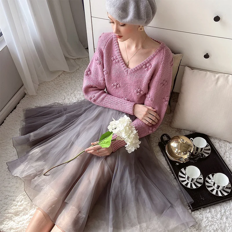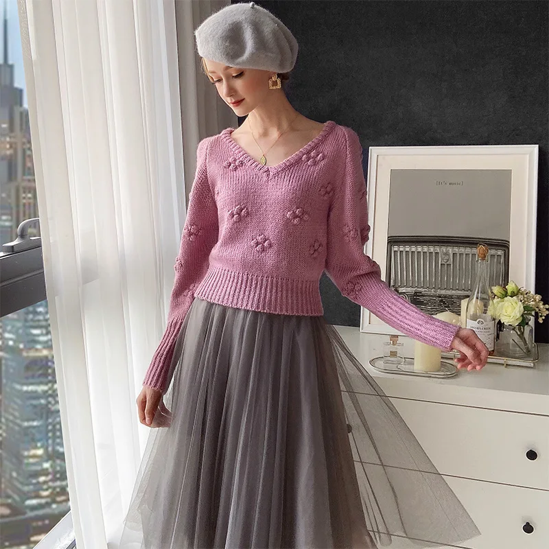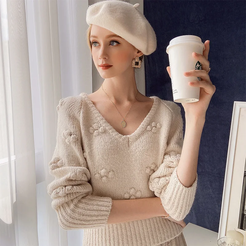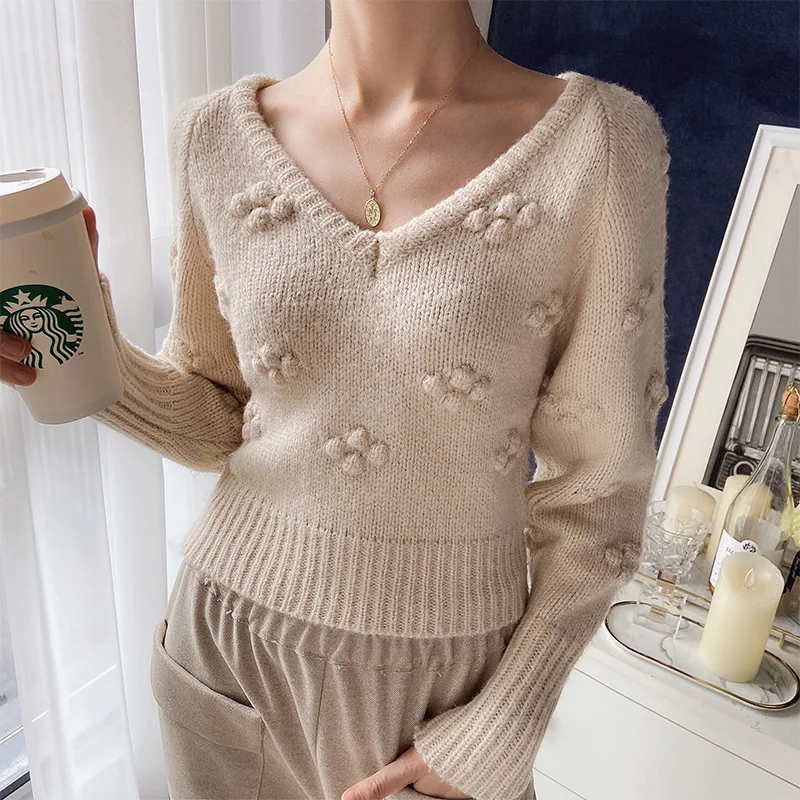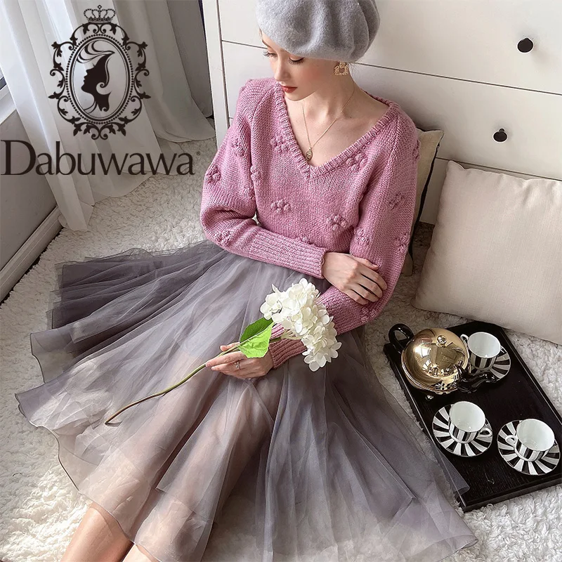 Женский свитер Dabuwawa с V-образным вырезом и помпоном, осенне-зимний вязаный свитер с рукавами-фонариками, женская уличная одежда, Дамский пуловер, DT1DKT024