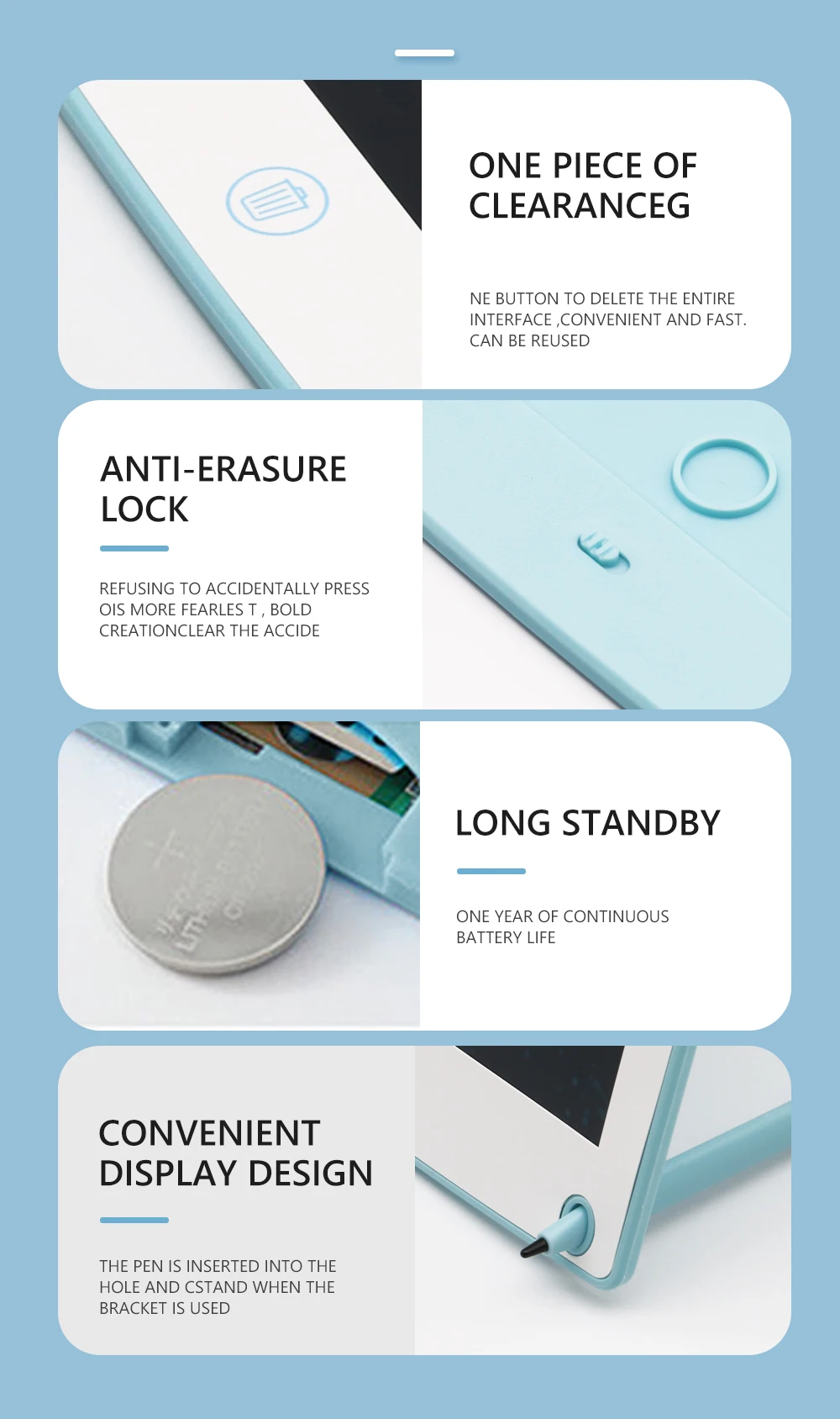 1. Простота в эксплуатации и высокая эффективность, Стирайте рисунок одним нажатием кнопки стирания. Имеет герметичную внутреннюю батарею, которая длится около 100000 стираний 2. Легкий и портативный, идеально подходит для школы, офиса, домашнего использования или другого использования. 3. Защитите глаза: ЖК-экран без излучения и бликов, хорошая защита глаз, будьте более безопасны и удобны при использовании в течение длительного времени. 4. Ультра-тонкий и компактный дизайн, легко носить с собой и может легко скользить в ваш портфель, рюкзак или другую сумку. 5. Встроенный сменный кнопочный элемент, вы не обязательно беспокоитесь о отключении питания. 6. Картина свободного стиля: Идеально подходит для заметок, составления списков, набросков, игр или всего, что вам нужно. 7. Безопасный и портативный: чехол для планшета и ЖК-дисплей изготовлены из прочных пластиковых материалов и безопасны для использования в школе и во всем доме, офисе и автомобиле.