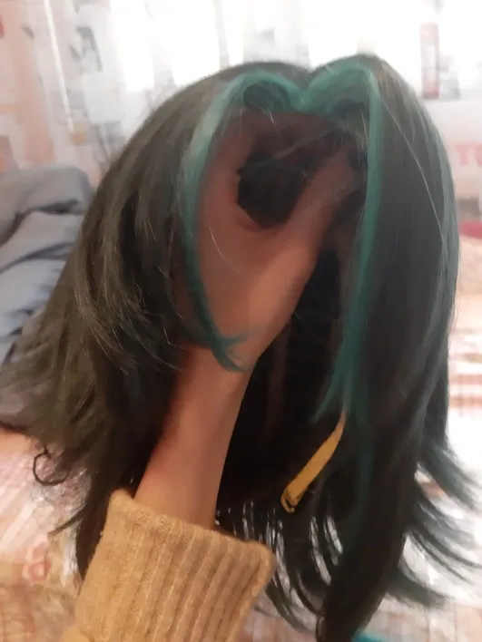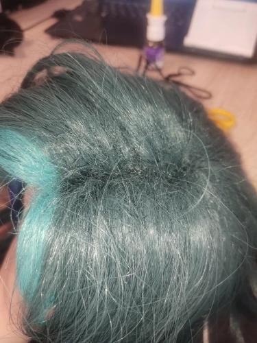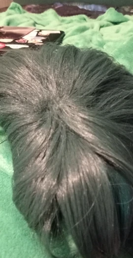 The dark hair on top was very green, though it changes in lighting. The pre cut hair wasn't even. It looked rushed, things bein even sewn in wrong. It sheds like no tomorrow. It's salvageable, but the quality drop difference in this wig compared to their others is very stark. You can see the pale skin colored wig net in the front with the part. Again, I can fix it, it doesn't look awful in pictures, and it DOES match the but at what cost? Disclaimer: My image of the wig is not styled and is completely just out of the package.