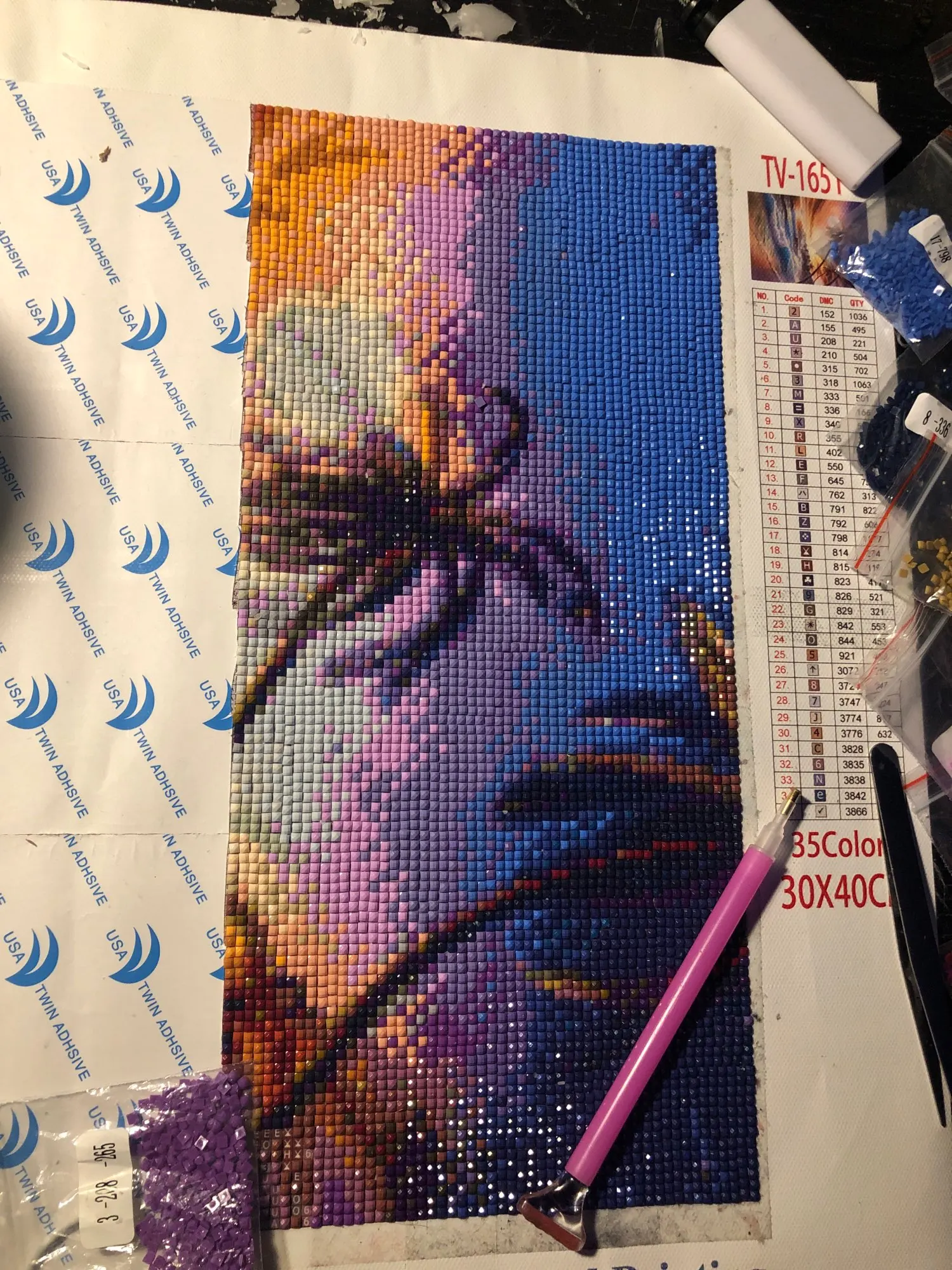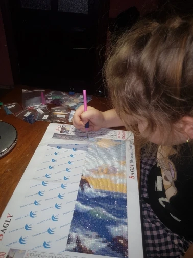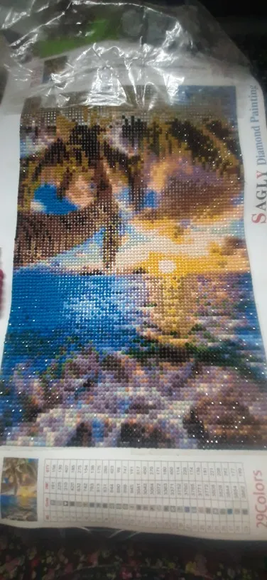 Трек отслеживался.Объединили несколько посылок в одну под одним треком,поэтому все отслеживалось и пришло в почтомат ближайшей Пятерочки менее чем за 3 недели в Челябинскую область.Стразы,воск и палочка для сборки на месте.Холст мягкий(не на картоне,как это бывает в дорогих алмазных мозаиках из магазинов!)Цветов хватает.Ровно 29 штук,как и заявлено.В пакетиках страз на донышке,от чего казалось,что их не хватит.Но вот я уже заканчиваю картину,и, вроде бы, всего хватает.По поводу картины: ожидались более яркие,четкие и контрактные цвета.На деле цвета словно грязные...какие-то блеклые и бледные(разница с мозаиками из фикспрайс видна на последнем фото,и почему-то на фото эта мозаика кажется даже ярчее,чем на самом деле),хотя само фото из которого сделана мозаика было весьма ярким,но почему-то стразы положили тусклые и мыльные.Ранее выкладывала мозаики из фикспрайс за 77 рублей.Так вот там цвета были действительно насыщенным и яркими.Закажу ещё.Мне понравилось заниматься этим делом.