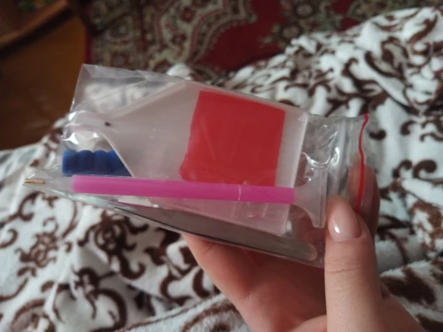 Пришла через чуть больше месяца. Картина в целости и сохранности, положили красную повязку на руку в качестве подарка. В набор входит сама картина, плотно запакованная в плёнку и склеенная в одном месте скотчем; две упаковки со стразами (в одной из упаковок лежал пакетик со специальными инструментами); положили так же распечатанный лист А4 с обозначениями (зачем-то)