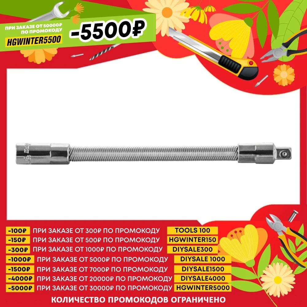 Гибкий удлинитель применяется для работы в труднодоступных местах при свободном вращении крепежа. Данное изелие категорически запрещается применять для начального ослабления и затяжки резьбовых соединений.