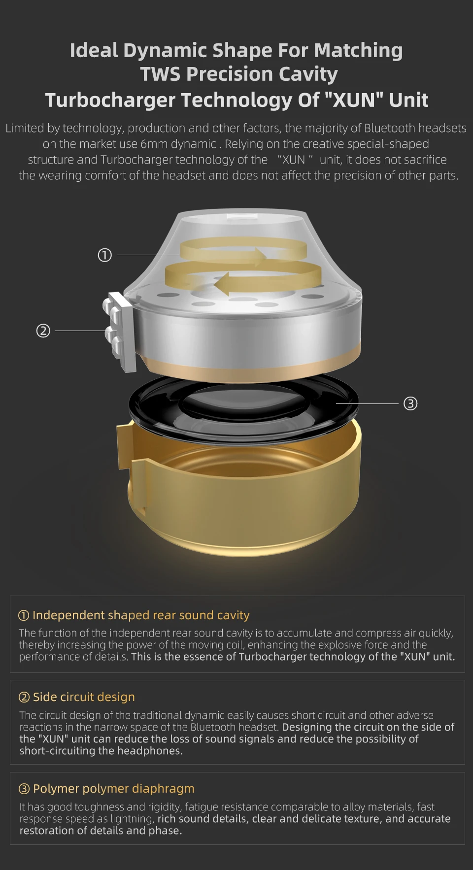 Конструкция цепи традиционного динамического легко вызывает короткое замыкание и другие негативные реакции в узком пространстве bluetooth-гарнитуры. Проектирование схемы сбоку блока «XUN» может уменьшить потерю звуковых сигналов и уменьшить возможность короткого замыкания наушников.
