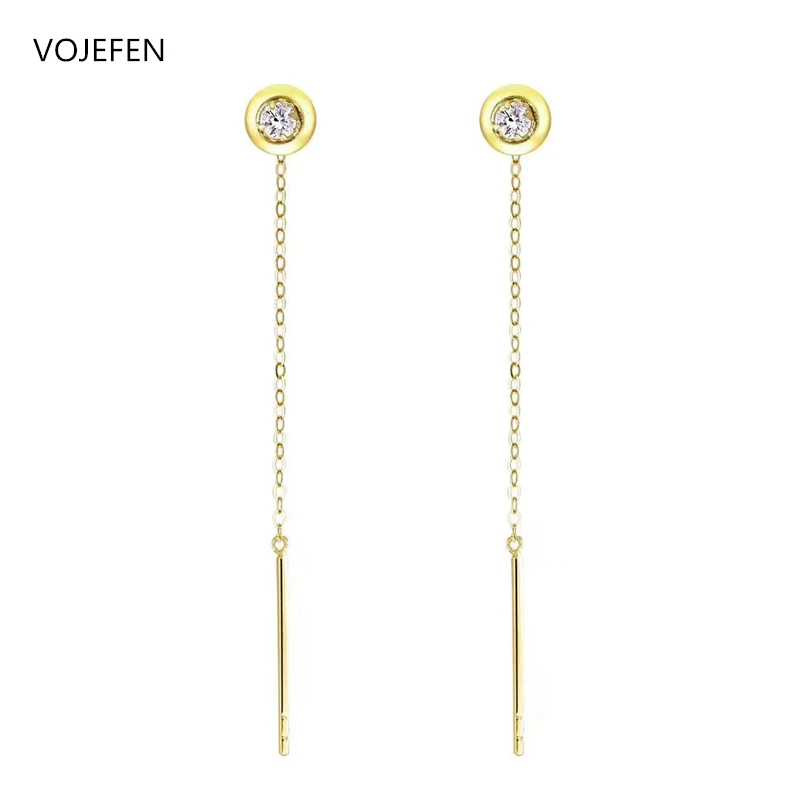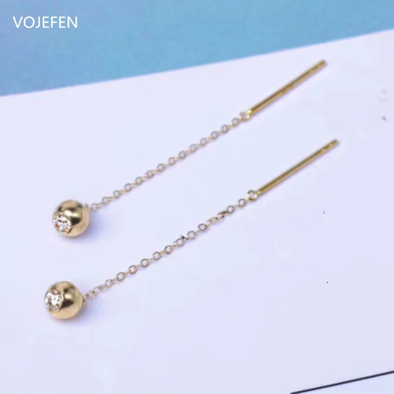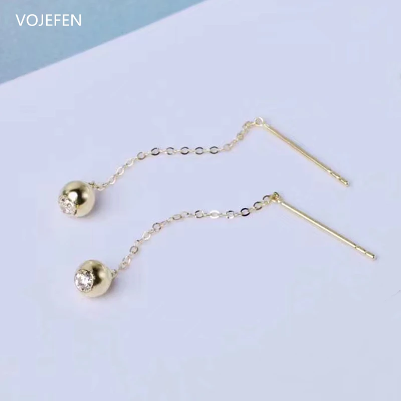 VOJEFEN Оригинальные 18k золотые серьги с круглыми шариками, минималистичные висячие серьги с длинной цепочкой, серьги с цирконием и кисточкой