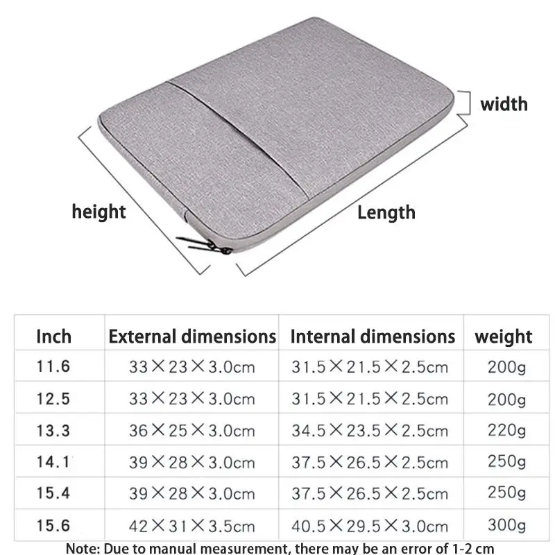 11,6/13,3/14,1/15,4/15,6 сумка для ноутбука Lenovo / ASUS/Macbook Air / Macbook pro / HP сумка для компьютераВнутренние размеры:Подходит для: ① 11,6 дюймов 33x23x3 см (длина х ширина х высота);Внешние размеры: 31,5x21,5x2,5 см (длина х ширина х высота)② 12,5 дюймов 33x23x3 см (длина х ширина х высота);Внешние размеры: 31,5x21,5x2,5 см (длина х ширина х высота)③ 13,3 дюйма 36x25x3 см (длина х ширина х высота);Внешние размеры: 34,5x23,5x2,5 см (длина х ширина х высота)④ Отделение для удостоверения личности-14,1 дюймов 39x28x3 см (длина х ширина х высота);Внешние размеры: 37,5x26,5x2,5 см (длина х ширина х высота)⑤ 15,4 дюймов 39x28x3 см (длина х ширина х высота);Внешние размеры: 37,5x26,5x2,5 см (длина х ширина х высота)⑥ 15,6 дюйма 42x31x3,5 см (длина х ширина х высота);Внешние размеры: 40,5x29,5x3 см (Длина x Ширина x высота)Передний вертикальный боковой карман Размер: 9,06x8,86 дюйма (Длина x Ширина).Изготовлен из водонепроницаемого полиэфирного материала, верхняя открывающаяся молния может скользить плавно, и устройство может использоваться удобно. Тонкий и легкий, он не делает устройство громоздким, и он может легко скользить в портфель, рюкзак или другие сумки.Дополнительный карман на передней панели обеспечивает достаточно места для хранения мыши MacBook, наушников, ручки и блокнота, что обеспечивает больше удобства. Защитный рукав с карманом защитный рукав защитная сумка идеально подходит для вас, чтобы вынуть ноутбук.Слой из полиэфирной пены и пушистая шерстяная подкладка могут поглощать удары и удары, а также защищать ваше устройство от пыли, грязи, ударов, ударов и случайных царапин.Совместим с MacBook Air/ASUS/Lenovo/HP и т. Д.Упаковка: 1 Компьютерная сумка