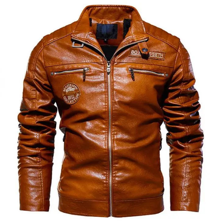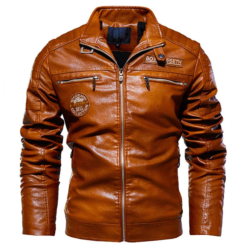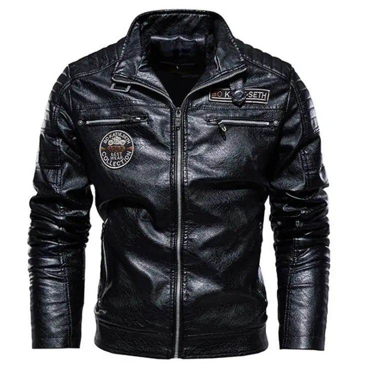 Мужская кожаная куртка из ПУ кожи, с флисовой подкладкой и воротником-стойкой
