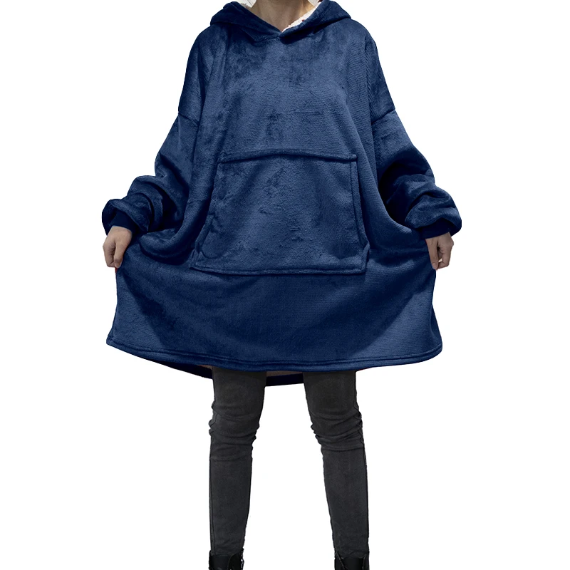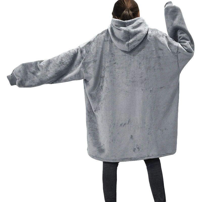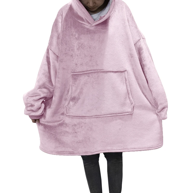 Зимние толстовки большого размера, флисовое ТВ одеяло с рукавами, Женский однотонный теплый гигантский халат, Свободный Длинный свитшот с большими карманами и капюшоном