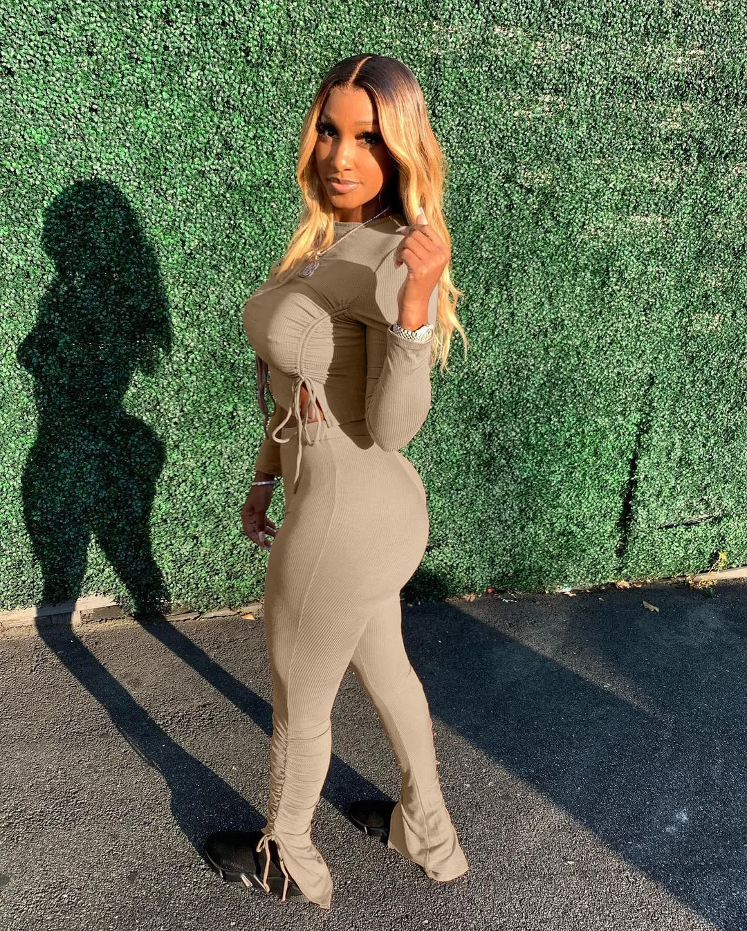 Женский костюм из двух предметов, однотонный, эластичный, с высокой кулиской, с рюшами, короткий топ с длинными рукавами в рубчик и спортивные штаны