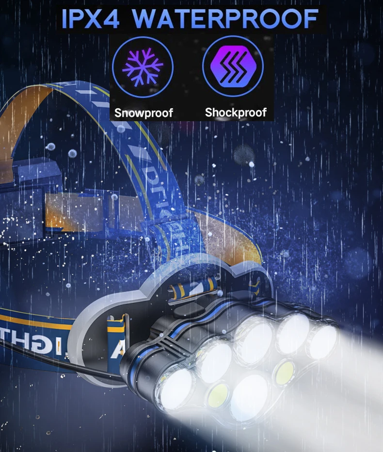 8 режимов освещения: светодиодный налобный фонарь имеет 2 кнопки режимов для управления 8 режимами для универсального использования. ①Нажмите кнопку «светодиодный режим», вы можете управлять режимами дальнего света, бокового луча, всего луча, стробоскопа SOS. ②Нажмите кнопку дополнительного режима COB, вы можете управлять режимами сильного луча, теплого луча, красный светильник, красный стробоскоп SOS.