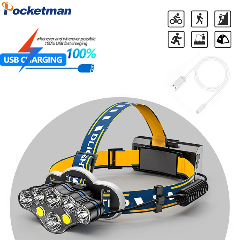 Налобный фонарь с 7 светодиодами, сильный светильник с зарядкой от USB, водонепроницаемый налобный фонарь, светильник с углом поворота 90 градусов, налобный фонарь, налобный фонарь