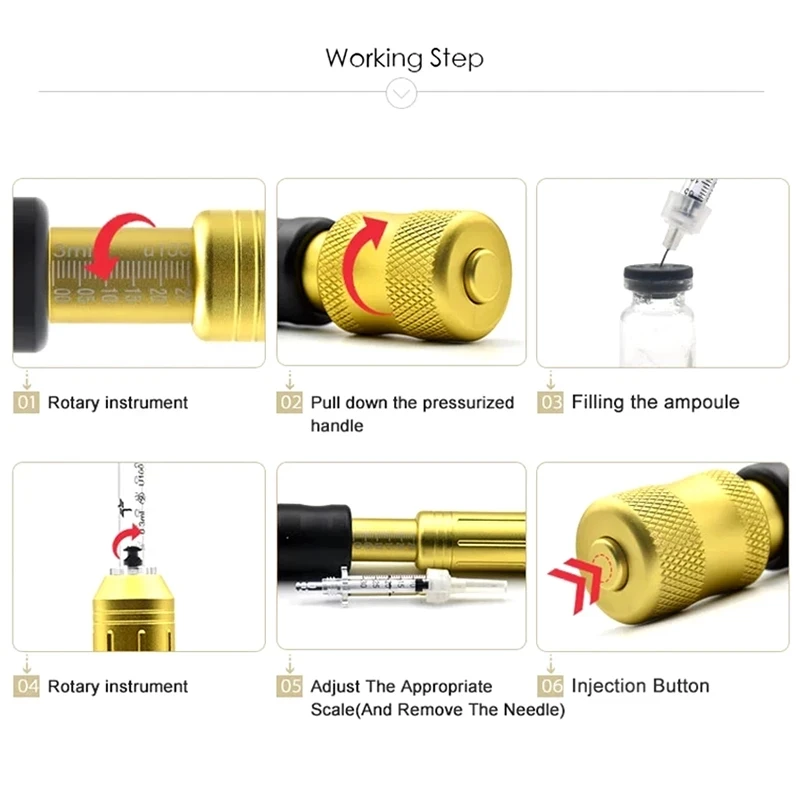 Что такое гиалуроновая ручка? Водяная мезотерапия предназначена для введения гиалуроновой кислоты в кожу. Гиалуроновая кислота содержит влагу, в 200-300 раз богатее организма. Делает кожу гладкой, мягкой, яркой и увлажненной после инъекции. Чтобы кожа оставалась увлажненной, дамы всегда выбирают различные средства по уходу за кожей. На самом деле, средства по уходу за кожей увлажняют только кутин. Так что при нанесении этих продуктов не удается глубоко увлажнить кожу. Как мы знаем, акне, морщины и неэластичность могут появляться, если коже не хватает влаги. Водяная мезотерапия решает все проблемы из-за нехватки влаги, такие как засолнутая кожа, цветные пятна, морщины... И он будет питать дерму влагой. Поэтому водяная мезотерапия хорошо справляется с отбеливанием, увлажнением и обновлением неэластичности. Характеристики: Название продукта: ручка для инъекций гиалурона Материал: нержавеющая сталь 304 Особенности: морщины, лифтинг лица, подтяжка кожи и т. Д. Особенности: -Помогает уменьшить пятна, морщины и следы. Функция укрепления и наполнения -Повышает уровень коллагена для создания новой и молодой кожи, реализует омоложение кожи. -Улучшает кожу, восстанавливает эластичность кожи, улучшает следы старения. -Могут заставить Антивозрастные средства проникать в глубокие слои кожи, не повреждая кожу, без побочных эффектов, безопасны в использовании. -Глубокое восполнение и богатое питание, укрепление кожи для впитывания косметического средства. -Он используется для более 10000 инъекций и управляется пружиной с автономным питанием. -Быстрая инъекция менее чем за 1/3 секунды, микроотверстие и автоматизированное давление пружины делают инъекции безопасными и безболезненными -Удаляет меланин из тела, улучшает темную и желтую кожу, делает кожу светлой и белой.