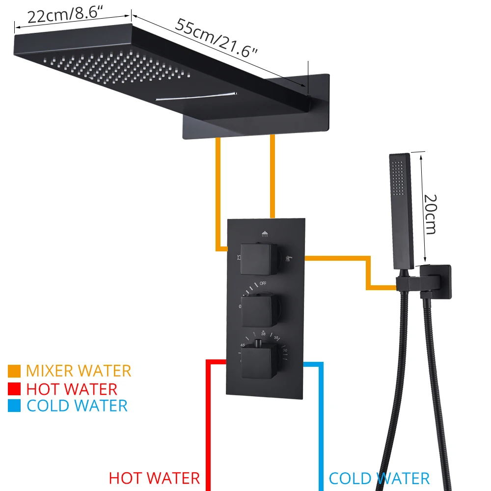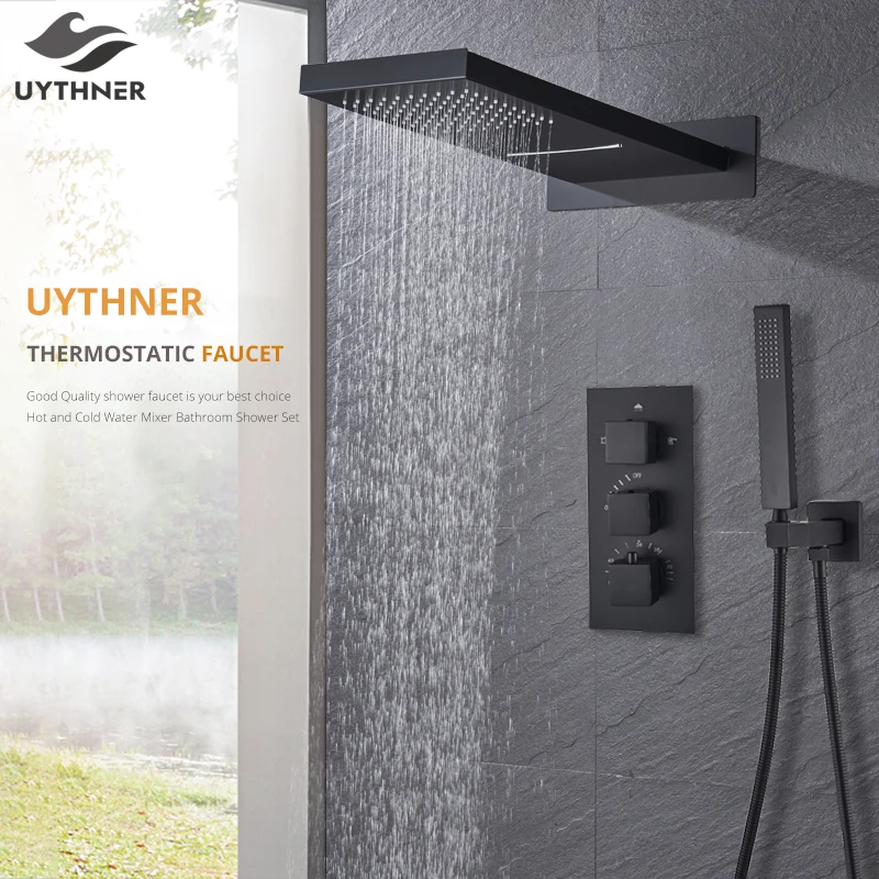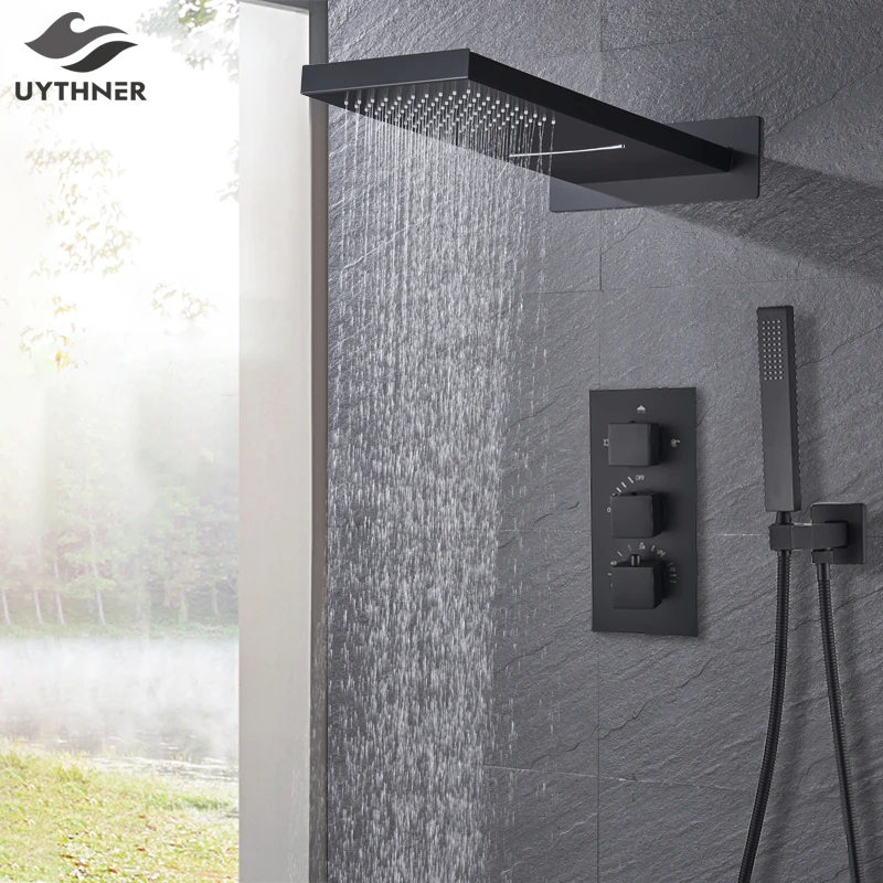 Роскошный водопад, смеситель для душа, термостат, клапан, смесители, настенный термостатический душ с ручным душем, черный смеситель