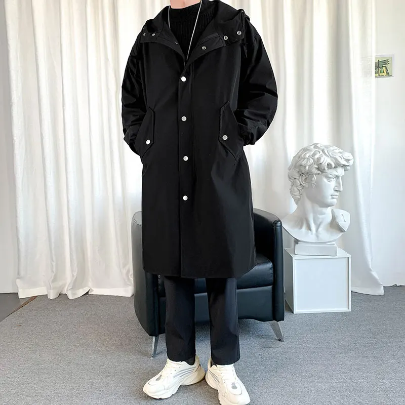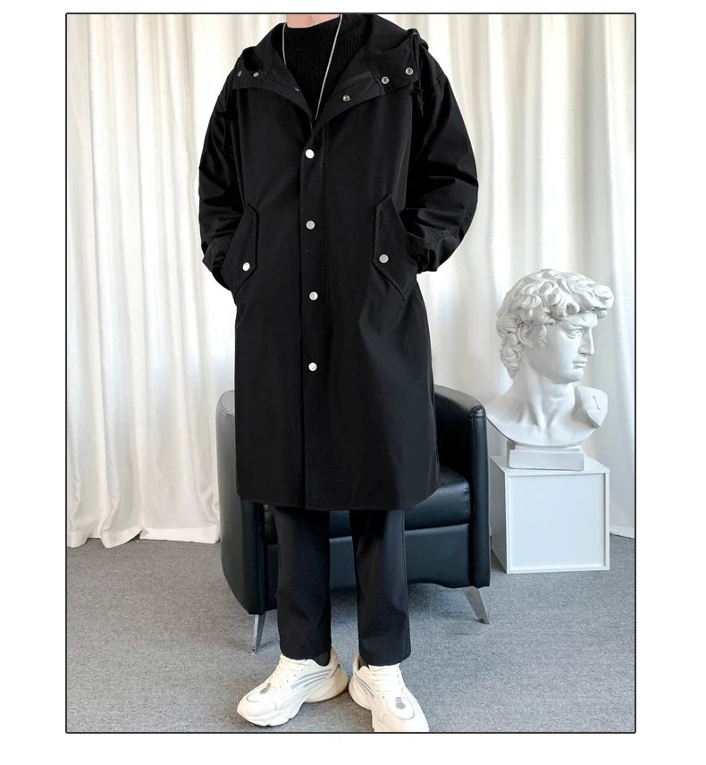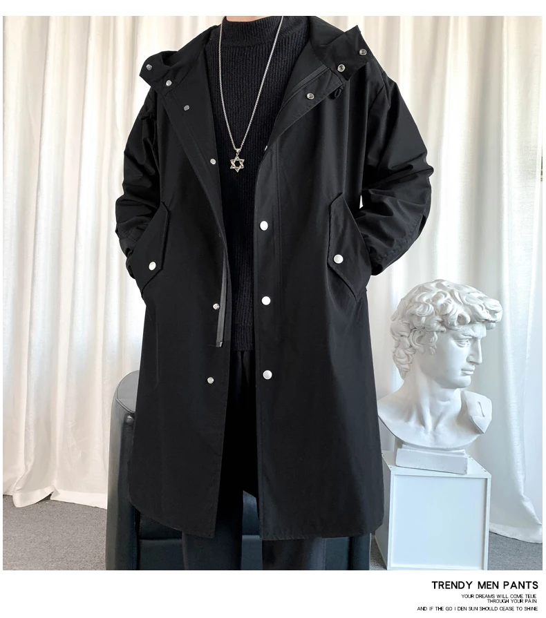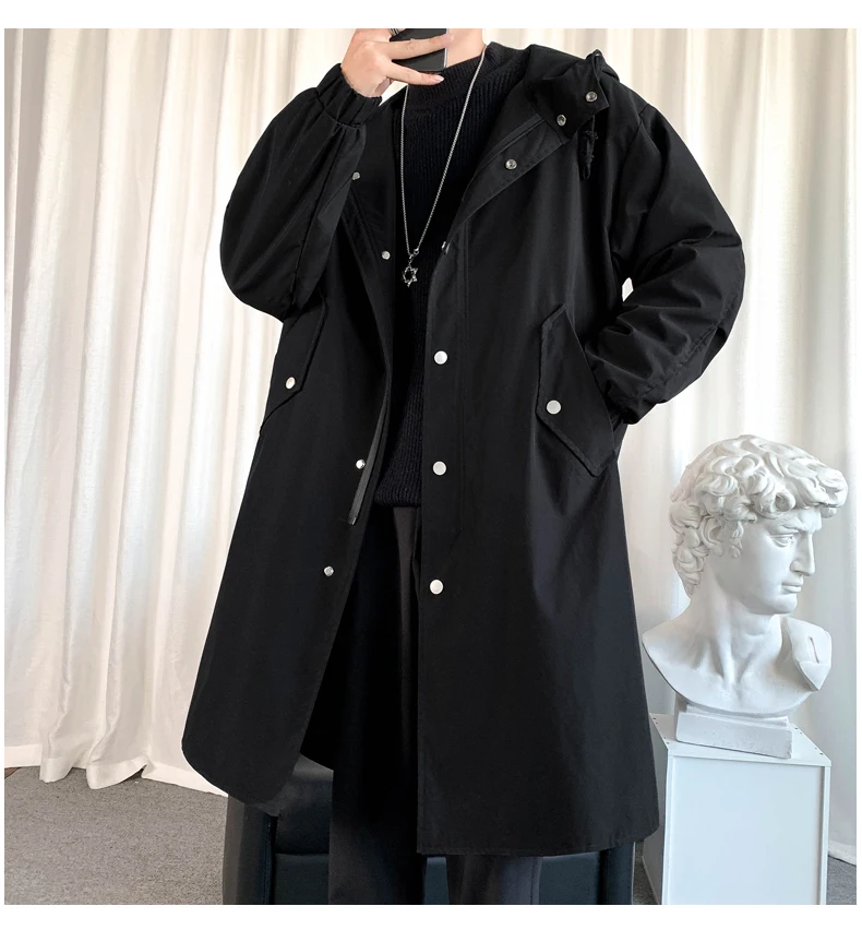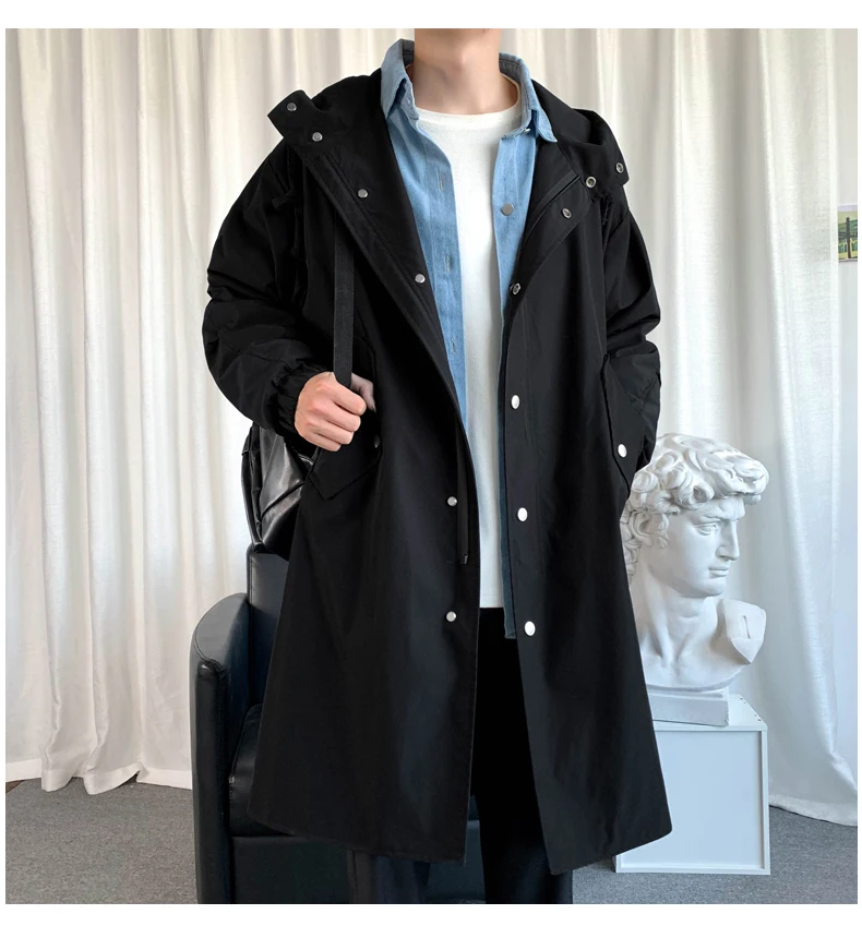 Тренч мужской с капюшоном, Длинная ветровка в стиле оверсайз, свободная уличная одежда, винтажное пальто, повседневная верхняя одежда, черный цвет