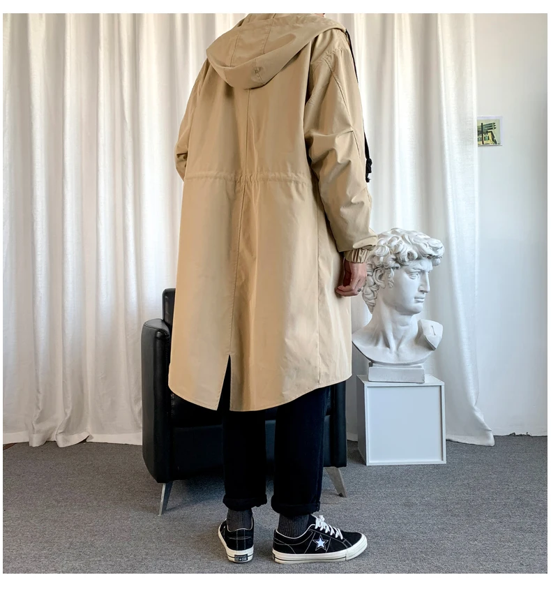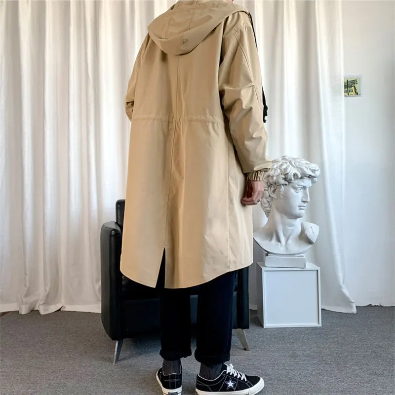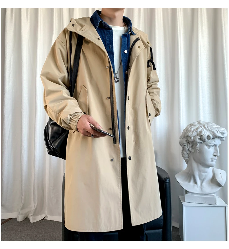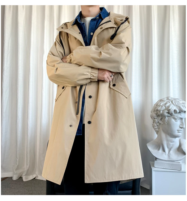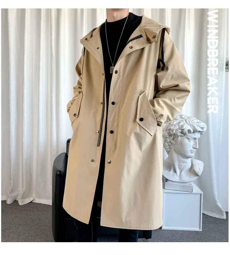 Тренч мужской с капюшоном, Длинная ветровка в стиле оверсайз, свободная уличная одежда, винтажное пальто, повседневная верхняя одежда, черный цвет