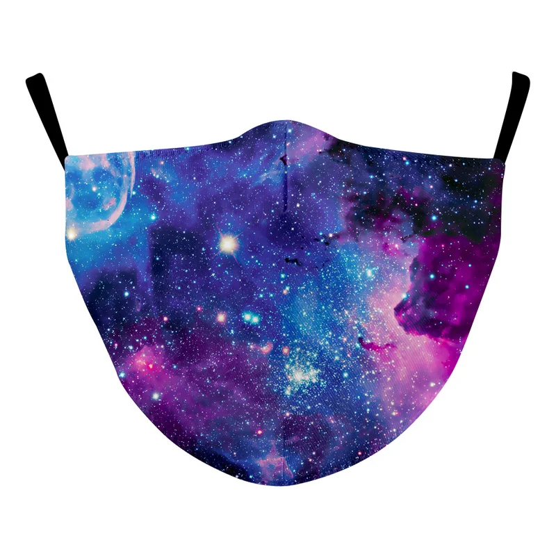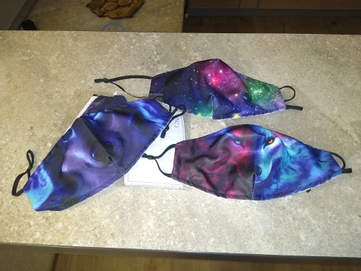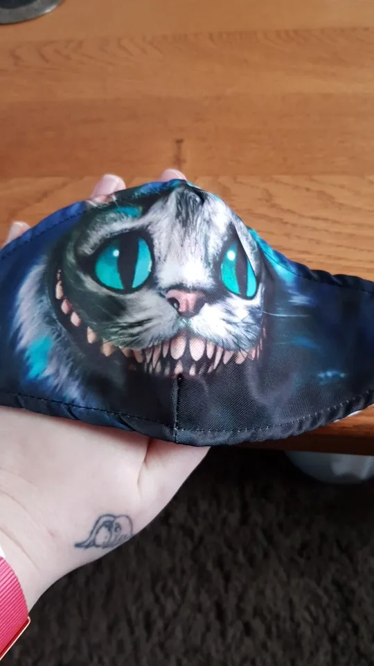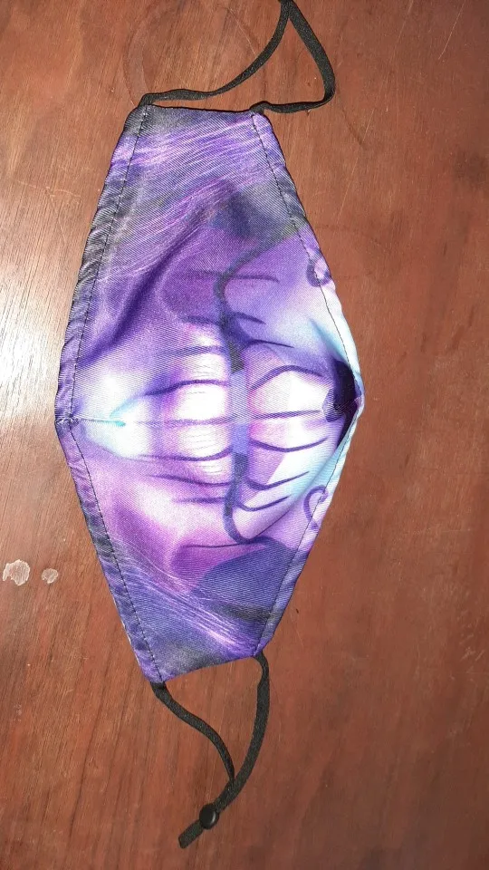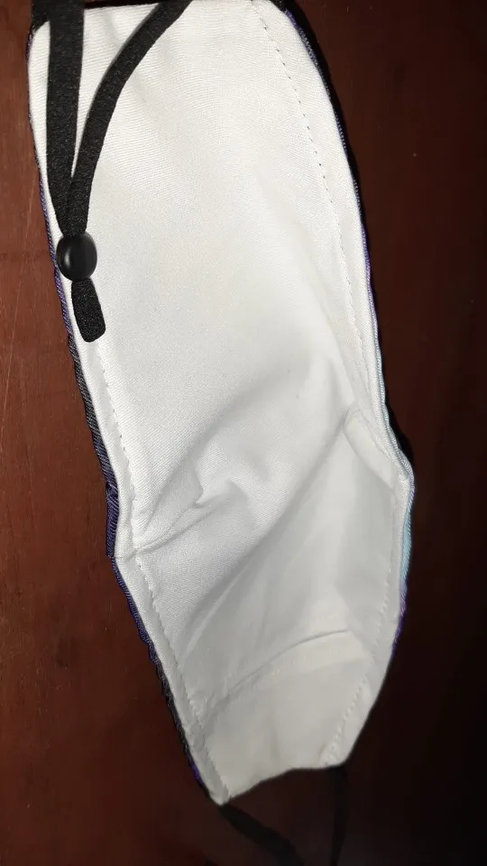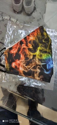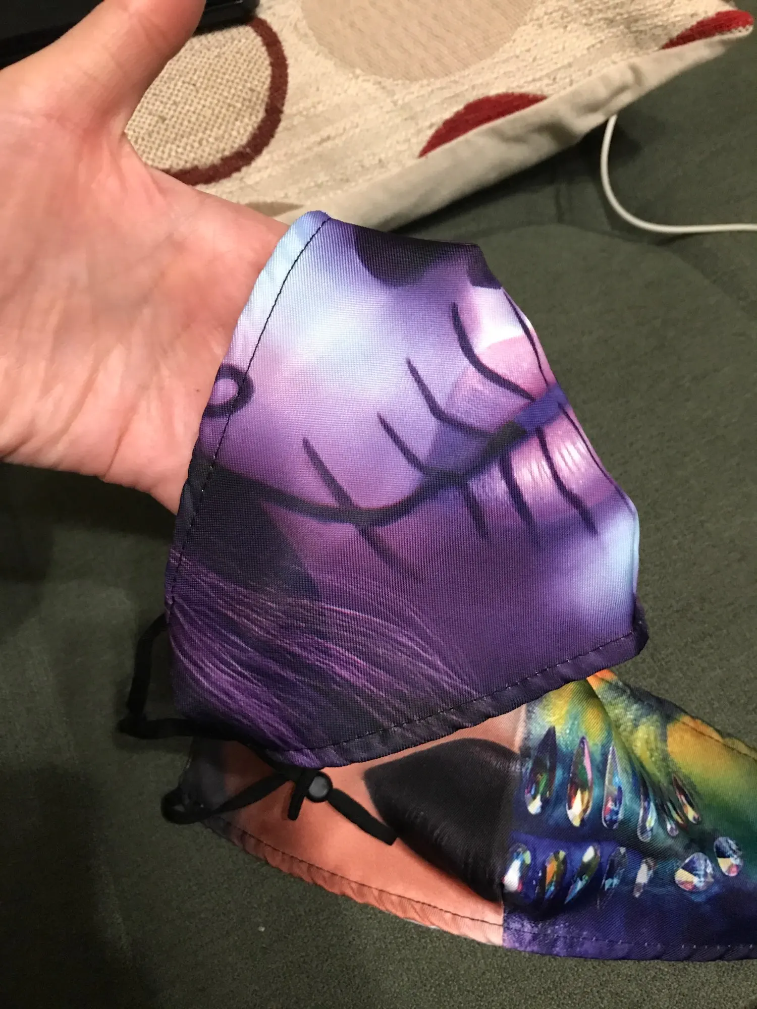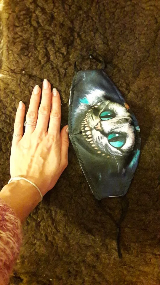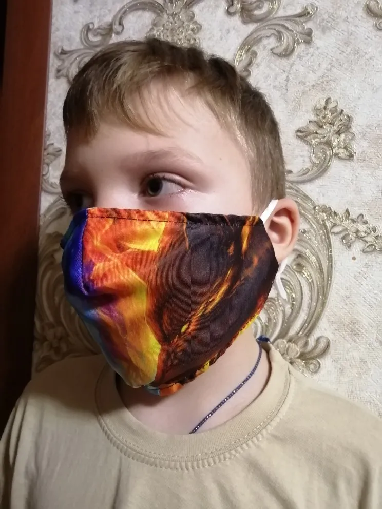 Кривовато прошито по принту, но цвет насыщеннее, чем на фото. Маска лёгкая, с разрезом для вставки под фильтр. Клипсу-зажим на переносицу вставлять не советую, внутри нечем будет дышать, попробуйте без клипсы зажать переносицу пальцами и поймёте сами. Удобно и туго регулируются ремешки. Конечно, как и все маски, от вируса не защитит, больше для оригинальности и красоты