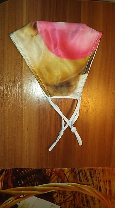 Все точно соответствует описанию. Сверху ткань типа иск. Шёлка. Принят яркий, как на картинке. Внутри мягкая, приятная на ощуп ткань. Завязки регулируются. Есть возможность вставить фильтр.