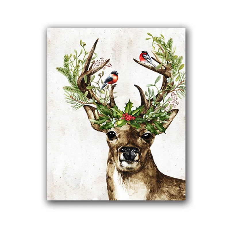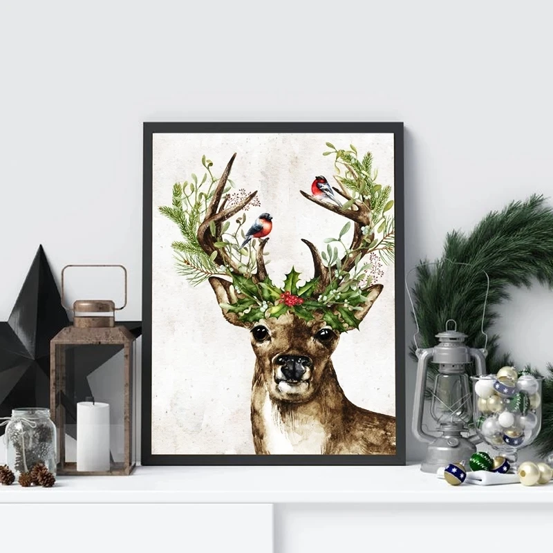 Лесной Животные Олень холст печать картина зима Холли ягоды стены искусства Рождество праздник украшение плакат картина домашний декор