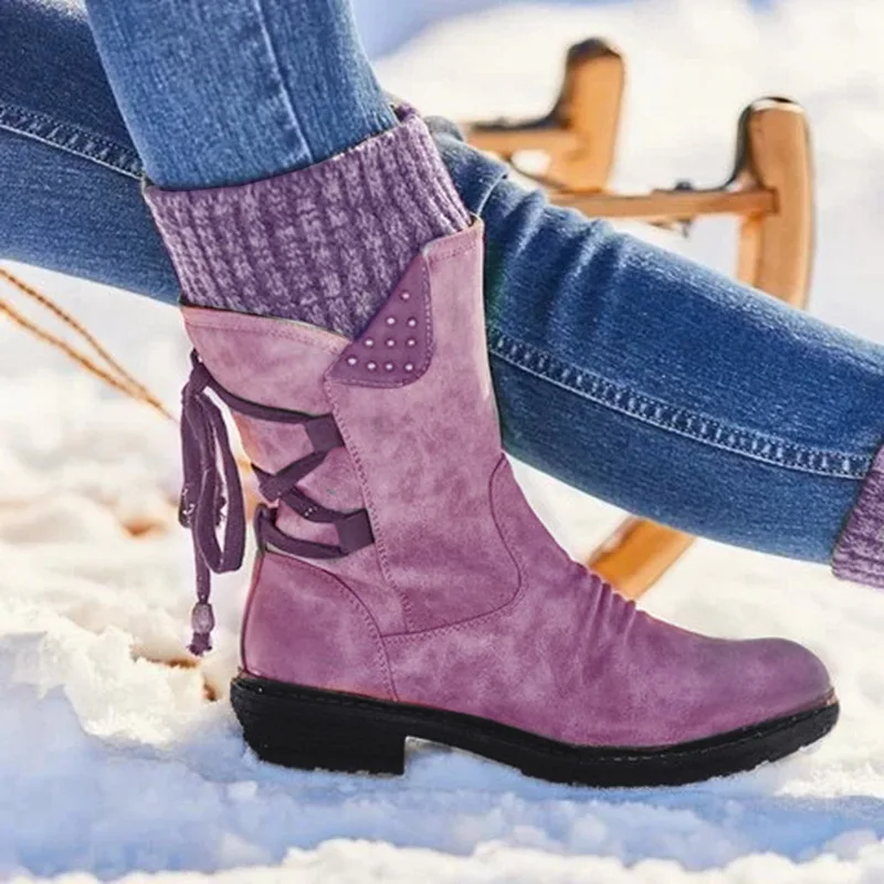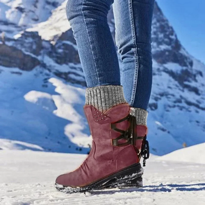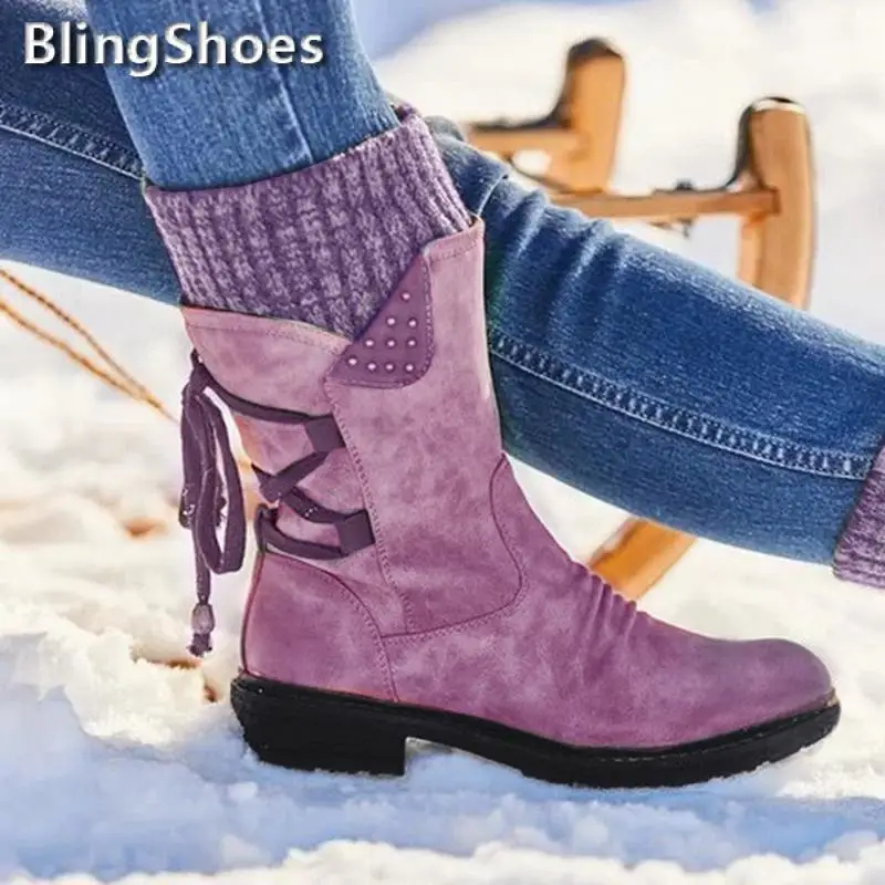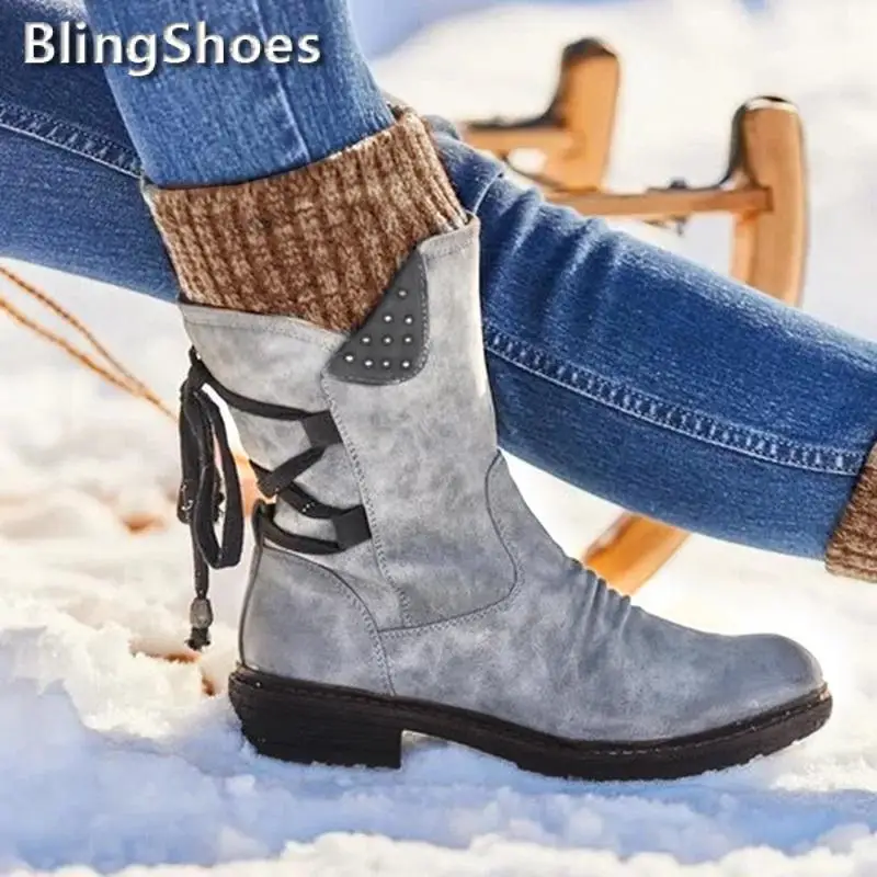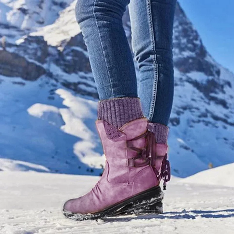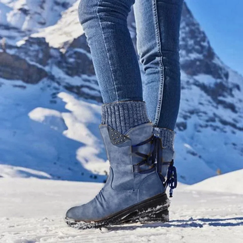Женские сапоги до середины икры, однотонные Нескользящие зимние сапоги на молнии, Модная вязаная Водонепроницаемая теплая обувь на шнуровке, зима 2021