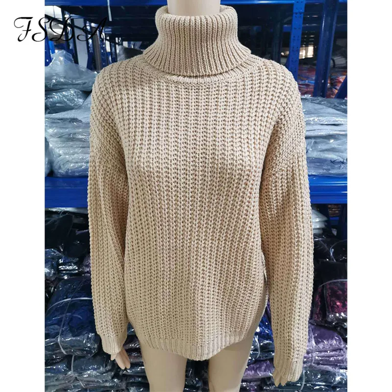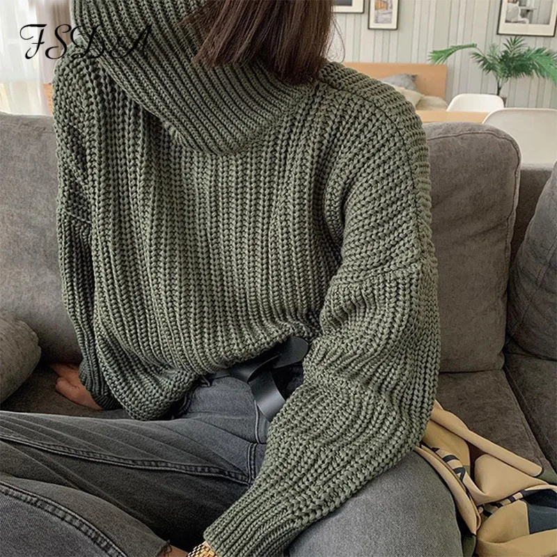 Свитер Женский вязаный с высоким воротом и длинным рукавом, цвета хаки, свободный, на осеньзиму, 2020
