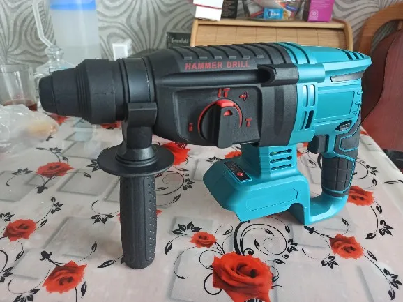 Товар добирался долго. Привёз курьер СДЭК. Упаковка хоть и была повреждена, но всё на месте и цело. По самому перфоратору: вес примерно как и у обычного(вместе с аккумулятором), но держать удобно; аккум становится слишком плотно, поэтому немного подпилил посадочное гнездо под защёлку; как и ожидал, бурит слабее сетевого, но буром на 10 в принципе можно работать. Брал его под монтажные работы под бур на 6 - электрика, потолки, ну или если лень тащить километр переноски. Скорость регулируется нажатием кнопки. Кнопка реверса утоплена - меньше шанс случайно переключить. Патрон работает хорошо, но внутри !сухой! Ручка и ограничитель удобные(поставил наоборот - мне так удобнее). По расходу аккума пока не знаю, но думаю жрать будет хорошо. Предполагаю, что 5ти амперного аккума хватит отверстий на 12 диаметром 10 и глубиной 200 мм. На гнезде акуума есть индикация заряда, кнопка рядом никаких функций не выполняет, но в описании этого и нет - всё честно. Сам перфоратор понравился.