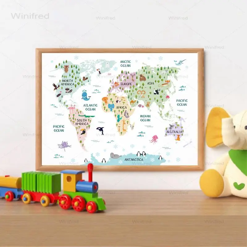 Карта мира, плакаты, принты, пастельный декор для детской комнаты, сафари, животные на тему мира, Карта мира, Настенная картина на холсте для украшения детской комнаты