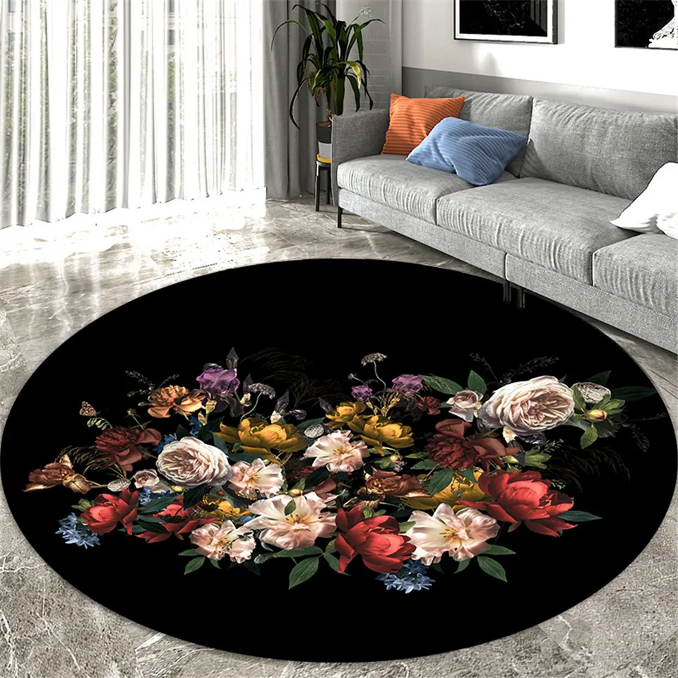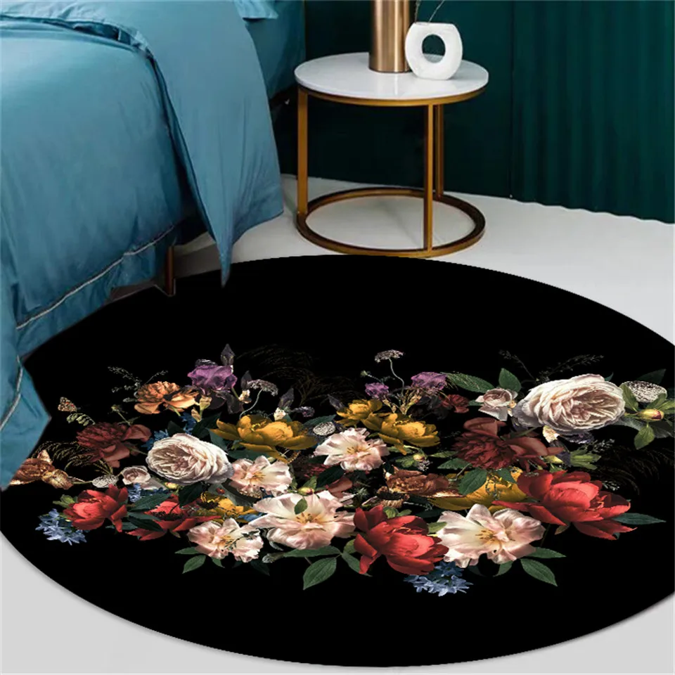 Круглый ковер в европейском стиле ретро с цветочным рисунком, черный ковер для спальни, прикроватный коврик для журнального столика, гостиной, стула, прикроватный коврик