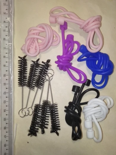 Брала с купонами в феврале. Доставка две недели в сборной. Продавец прислал всё из заказов. Ремешки силиконовые, длина 56,5 см, розовые не отличаются, фиолетовый оказался светлее и ярче. Щётки 7 см. Продавцу спасибо, рекомендую.