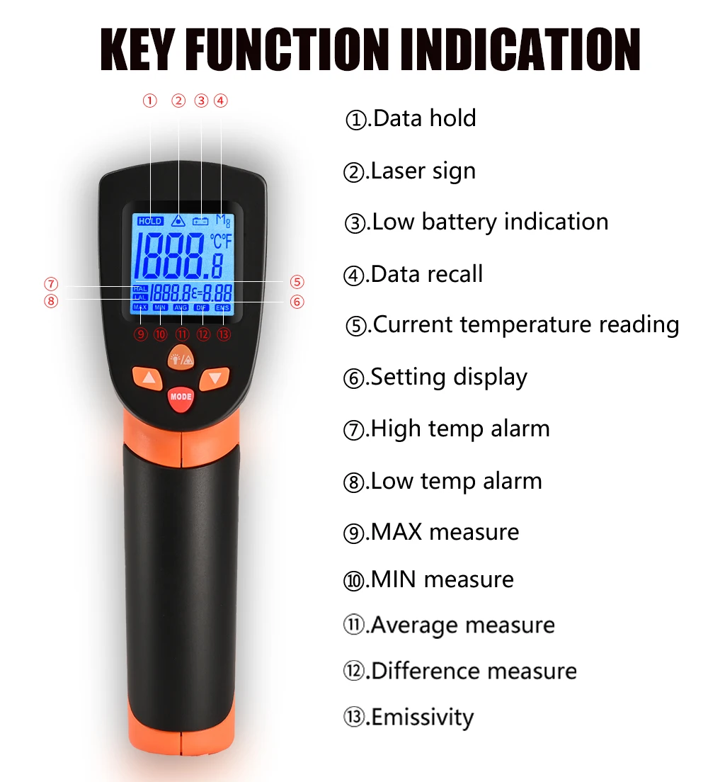 • Лазерная указка для точного прицеливания• Простое управление одной рукой• ЖК-дисплей со спинкой светильник• Переключатель включения/выключения лазера• Индикация низкого заряда батареи• Светодиодный светильник для работы при плохом освещении• Преобразование температурного блока C /F• Автоматическое выключение в течение 15 секунд без каких-либо действий• Удержание дисплея, функция сканирования