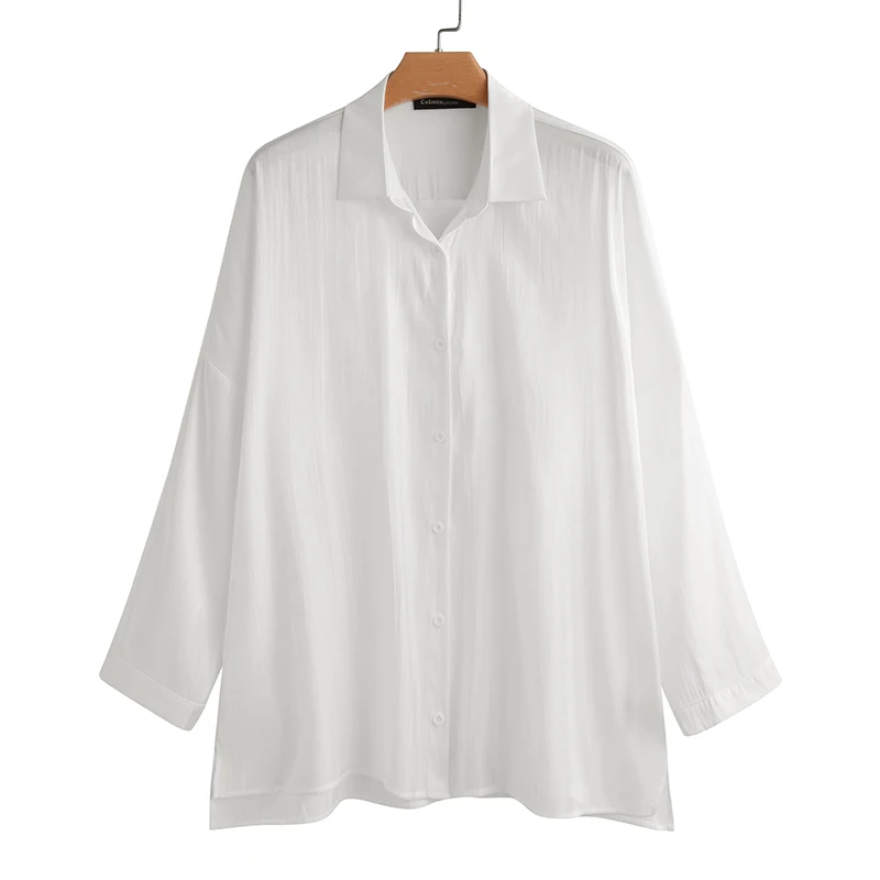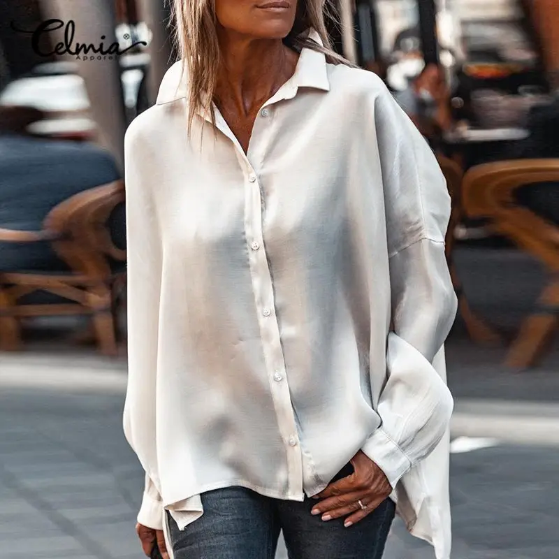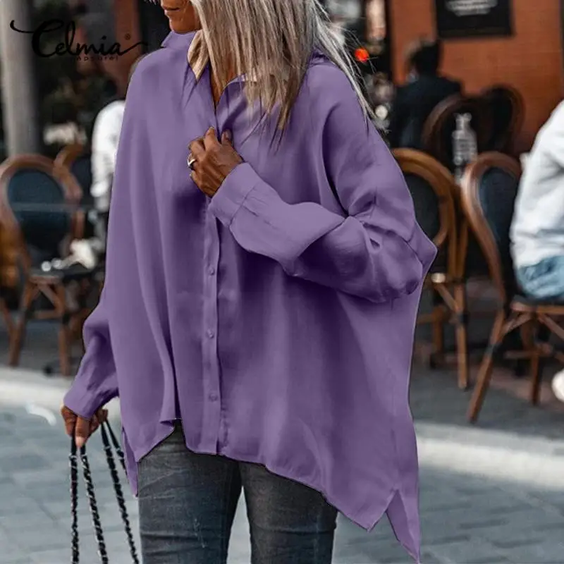 Осень 2021, однотонные офисные рубашки Celmia с длинным рукавом, женская модная блузка с лацканами, повседневные свободные топы на пуговицах, однотонные праздвечерние чные Блузы 7