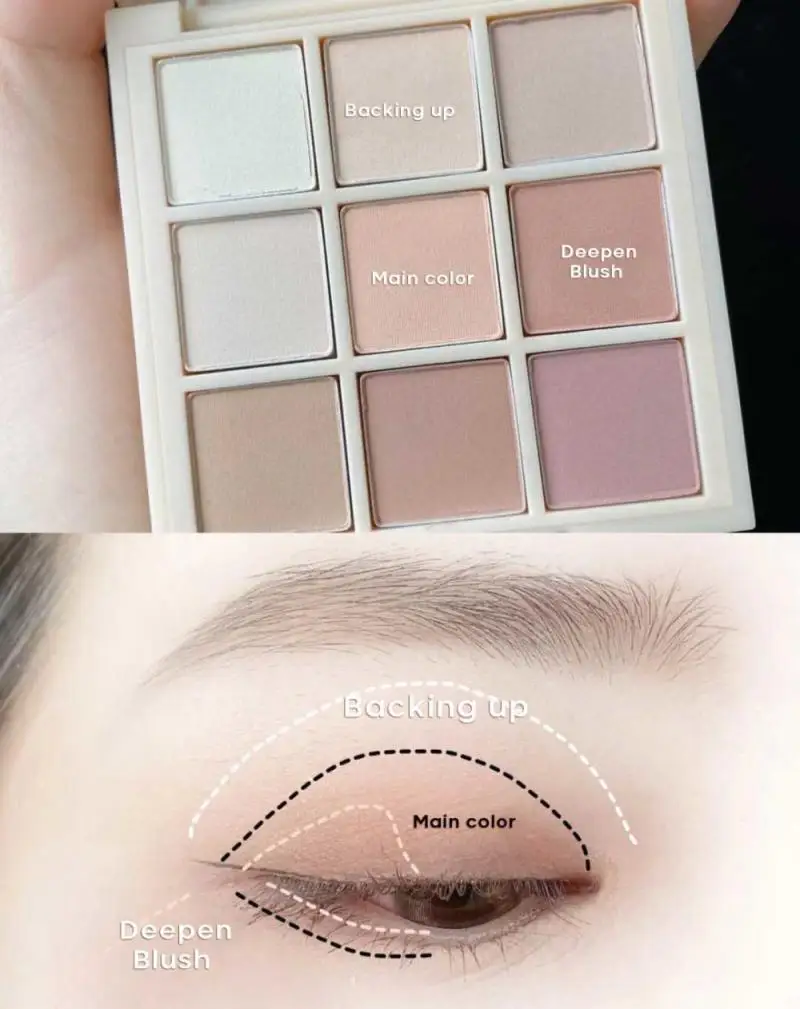 • Смешайте тени плавно, используя более темные оттенки в складке, и более светлые оттенки вдоль бровей и внутренних углов глаза.