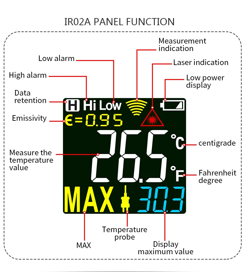 IR02A:-50 ~ 800CIR02B:-50 ~ 800C, функция термопарыIR02C:-50 ~ 800C, функция термопары, влажность окружающей среды, точка росы, измерение плесени