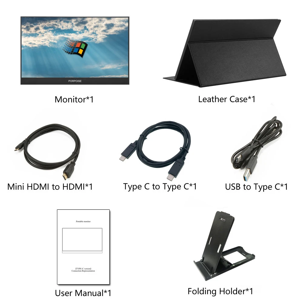 1 x Монитор1 x Type-C to Type-CКабель Type-C-1 шт.1 х HDMI кабель1 х складной держатель1 x Кожаный Чехол
