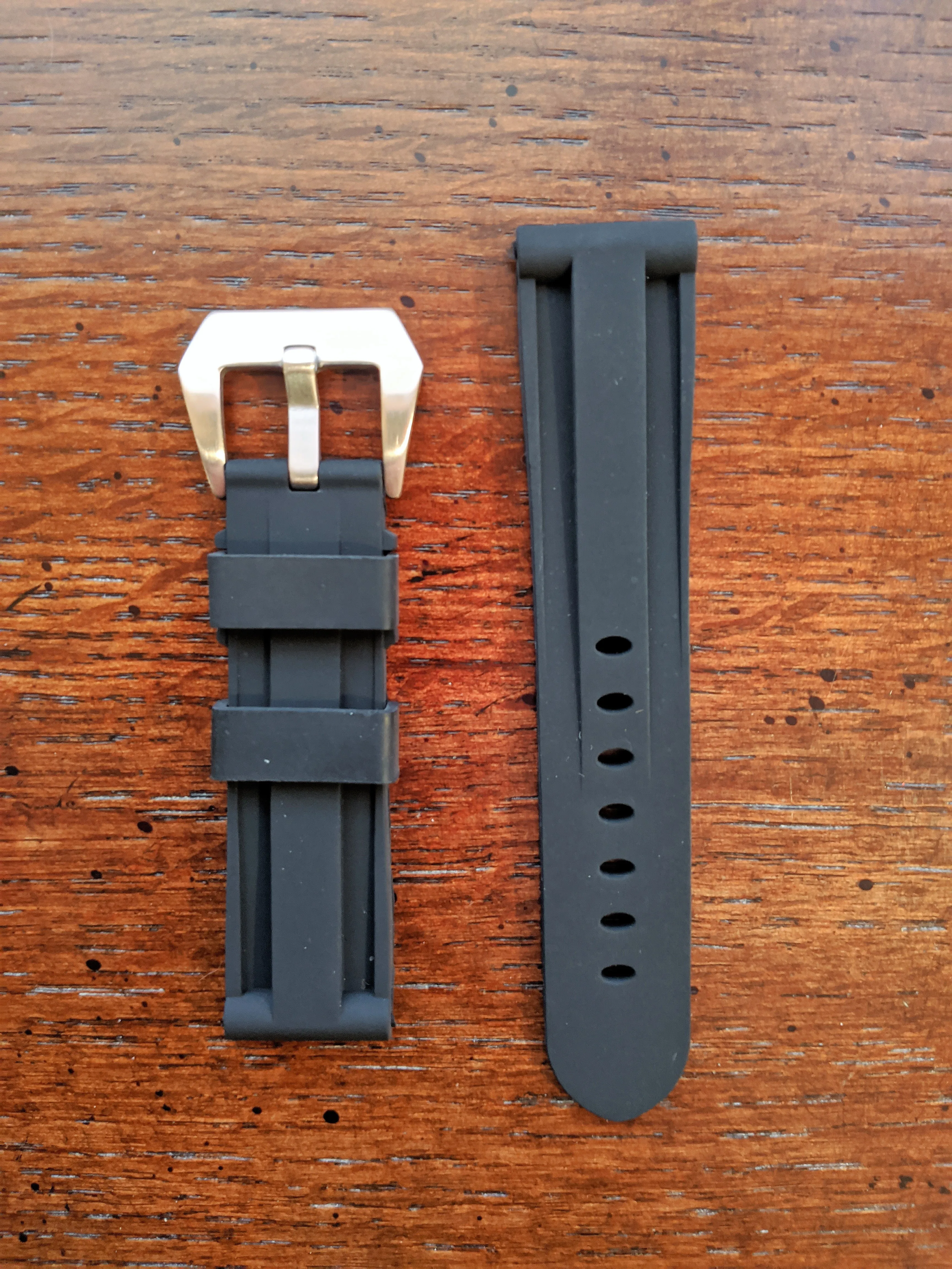 Это очень качественный резиновый ремешок для часов с превосходным внешним видом. Материал плотный и гибкий, кажется очень крепким и удобным на запястье. Фурнитура прочная и имеет последовательную щетку. Ремешок состоит из двух держателей, а не одного, как показано на фотографиях. Первый Хранитель удерживает на месте четыре небольших выступа на боковой части ремешка, второй может быть расположен свободно. Длина ремешка составляет 120 мм, а короткий-75 мм (без пряжки). Два пружинных стержня и пружинный инструмент были включены, и продавец отправил очень быстро. Очень настоятельно рекомендуем.