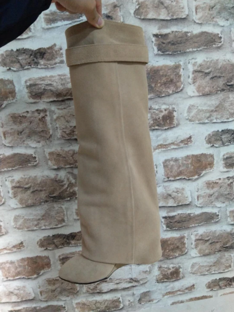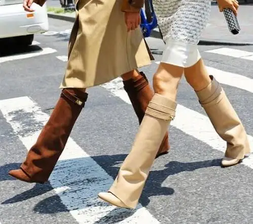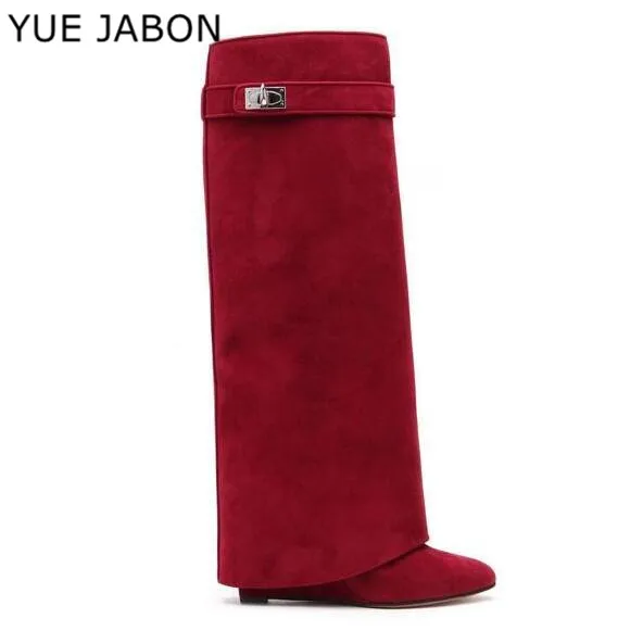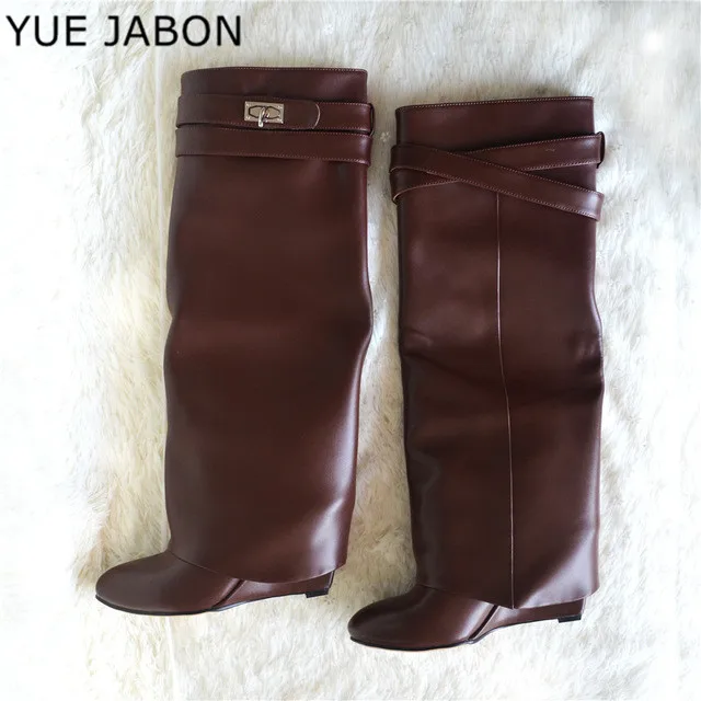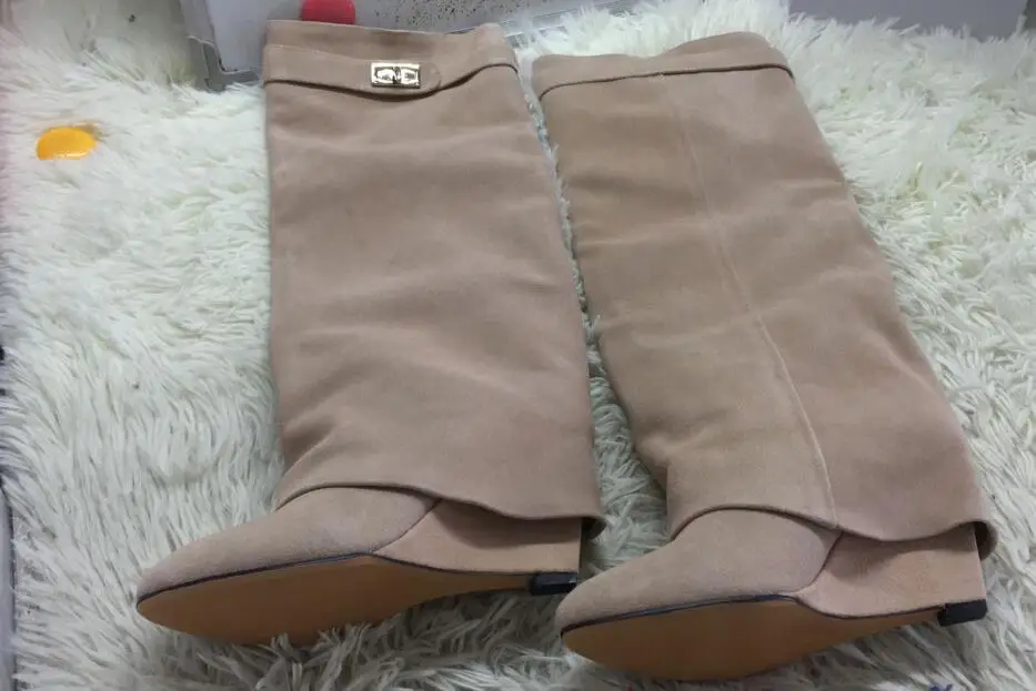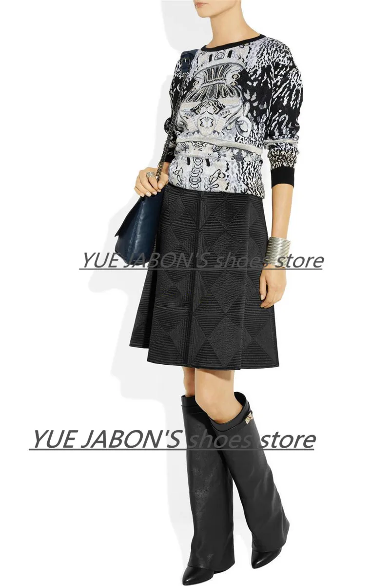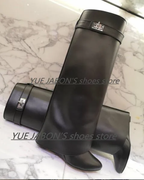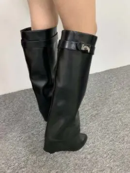 Женские сапоги выше колена с острым носком, серебристые кожаные сапоги на танкетке с замком Акула, высокий каблук, обувь на высоком каблуке