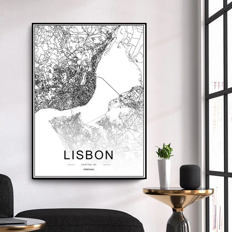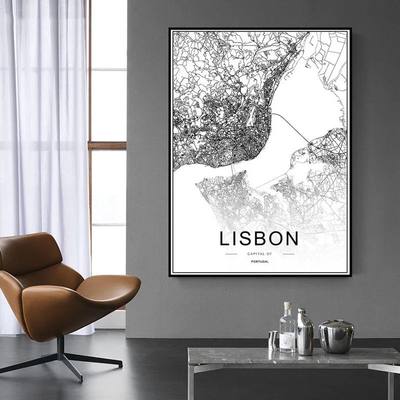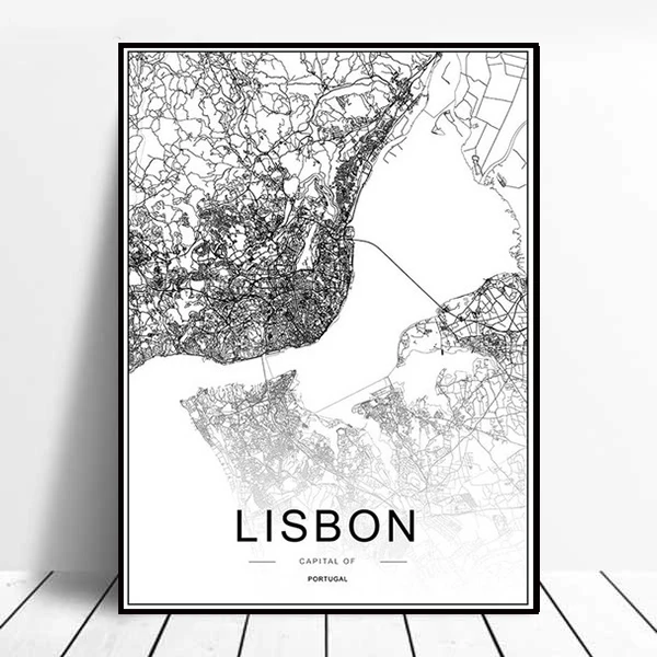 Португалия Лиссабон Карта города Черный и белый Абстрактная живопись плакат пользовательские карты современное искусство, принт декоративные холст картины Гостиная
