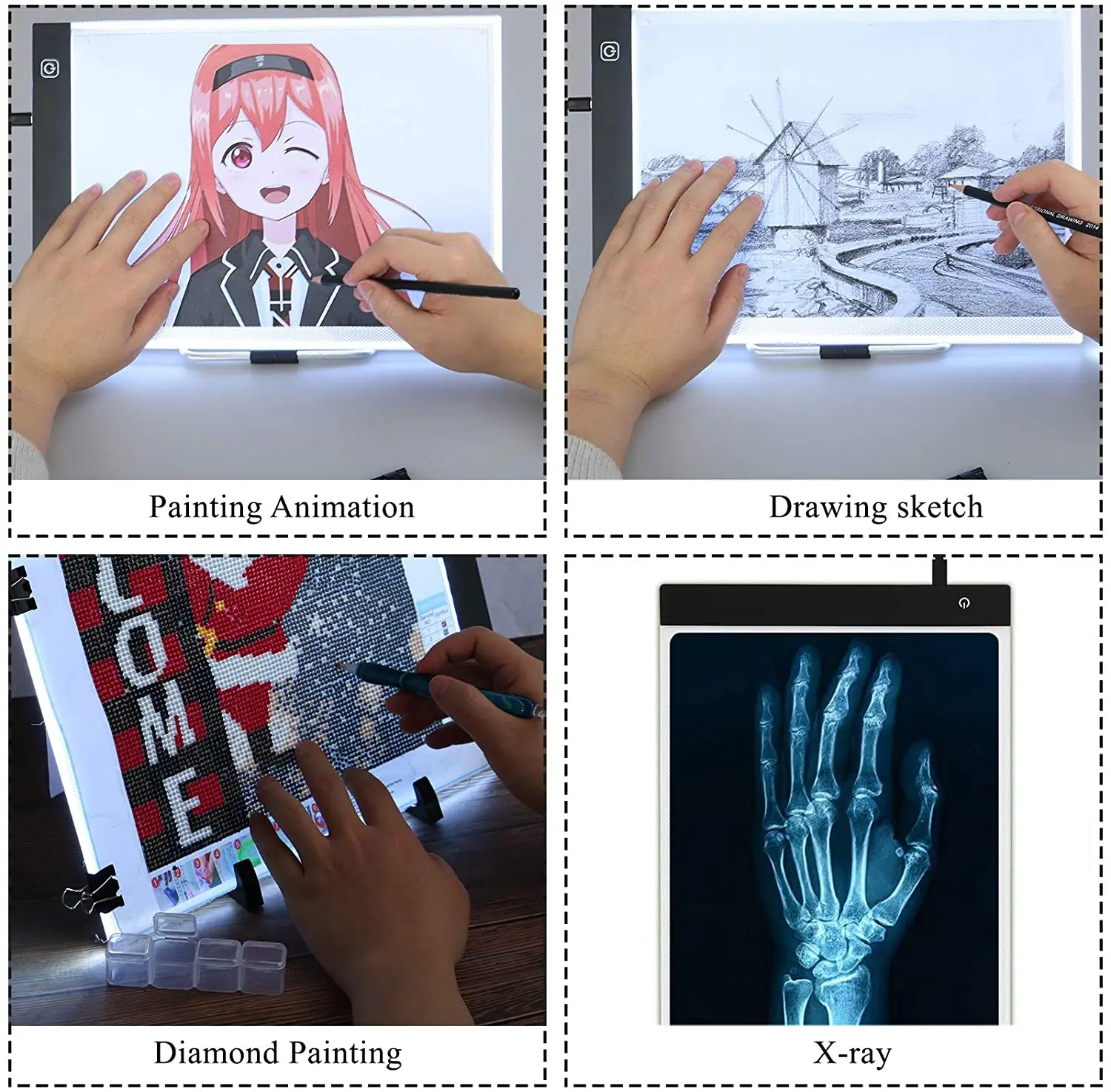 (Размер A3A4 A5) ►►широко используется-используется для просмотра отрицательных фильмов, отслеживания художественных работ, каллиграфии, скрапбукинга, перевода татуировок, шитья, Просмотра рентгеновских фильмов, алмазной живописи и т. д.Регулируемая яркость-►long нажмите кнопку ВКЛ/ВЫКЛ для регулировки яркости.Мелкие детали, не для детей в возрасте до 3 лет.Требуется наблюдение взрослых.