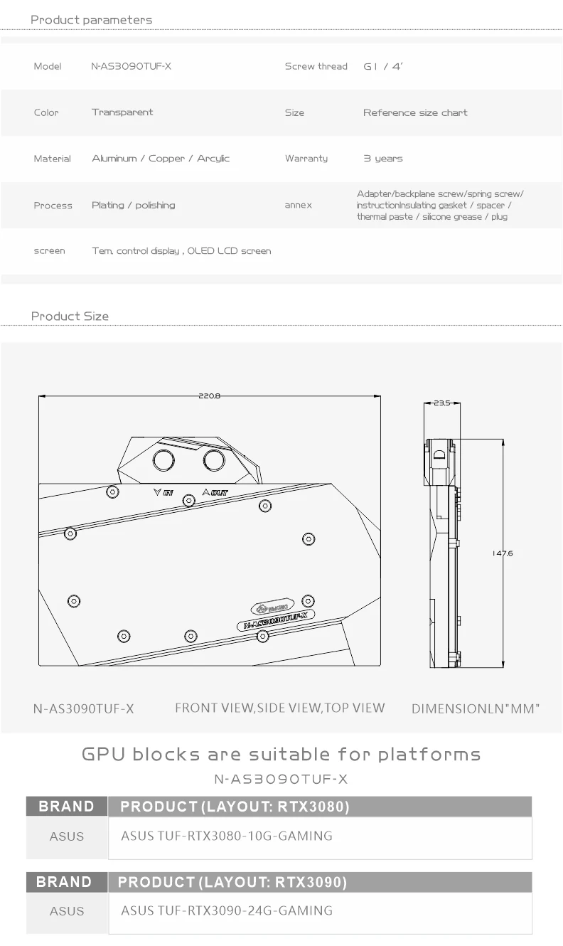 Совместимый список (включая, но не ограничиваясь следующими моделями)Материнская плата ASUS TUF RTX3080 игроваяМатеринская плата ASUS TUF RTX3090 игроваяPOM нужно 3-4 недели для изготовления на заказ, если вы не можете ждать, купите акриловую модель, пожалуйстаПожалуйста, судите, может ли блок быть применен к вашей видеокарте в соответствии с печатной платой, положение ядра/видеопамяти/конденсатора/индуктора/винтового отверстия должно быть 100% совместимым, количество видеопамяти/конденсатора/индукторов может незначительно отличаться в зависимости от модели карты.