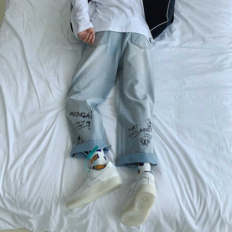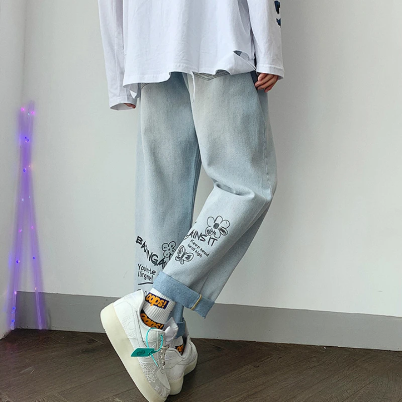 Мужские джинсы с цветочным принтом, свободные прямые ретро-Модные мужские мешковатые универсальные повседневные шикарные джинсовые брюки в Корейском стиле, ковбойские