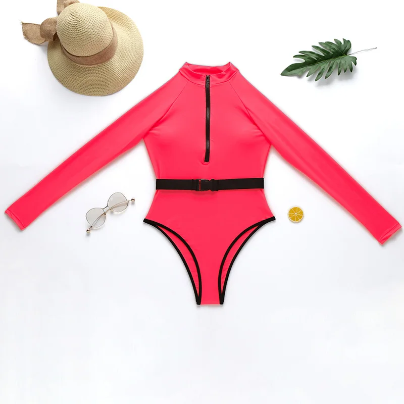 Женский слитный купальник на молнии, с длинным рукавом и поясом