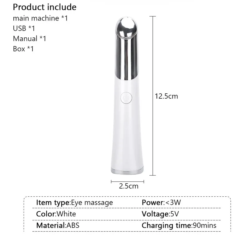 1 x электрическая ручка для массажа глаз 1 х USB кабель для зарядки 1 х Руководство 1 x коробка