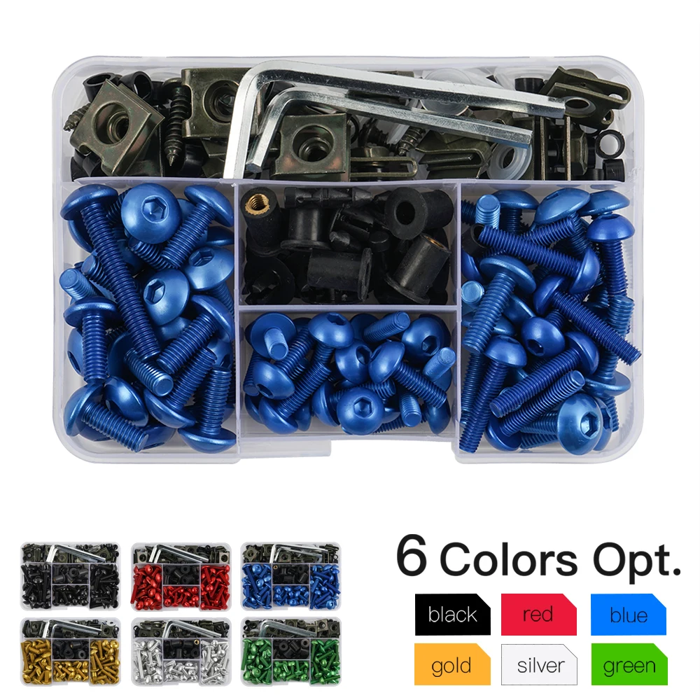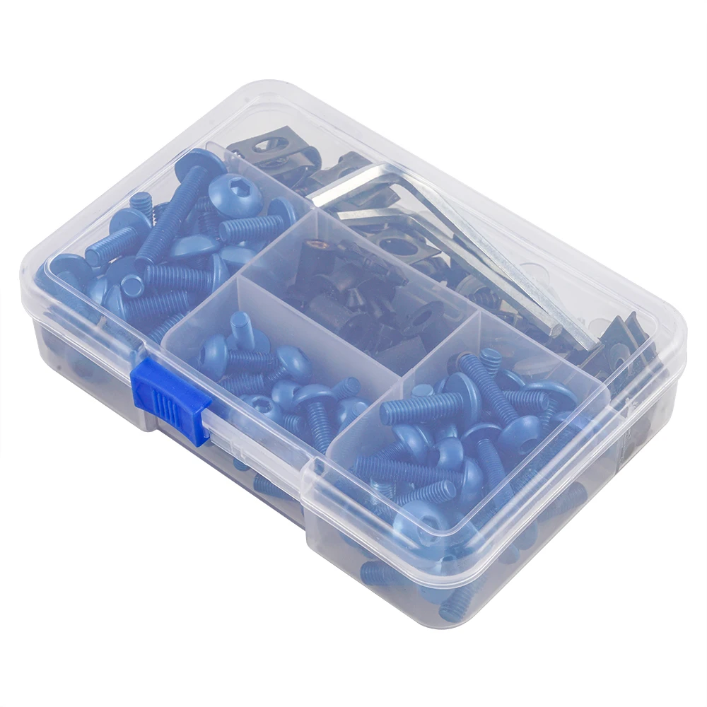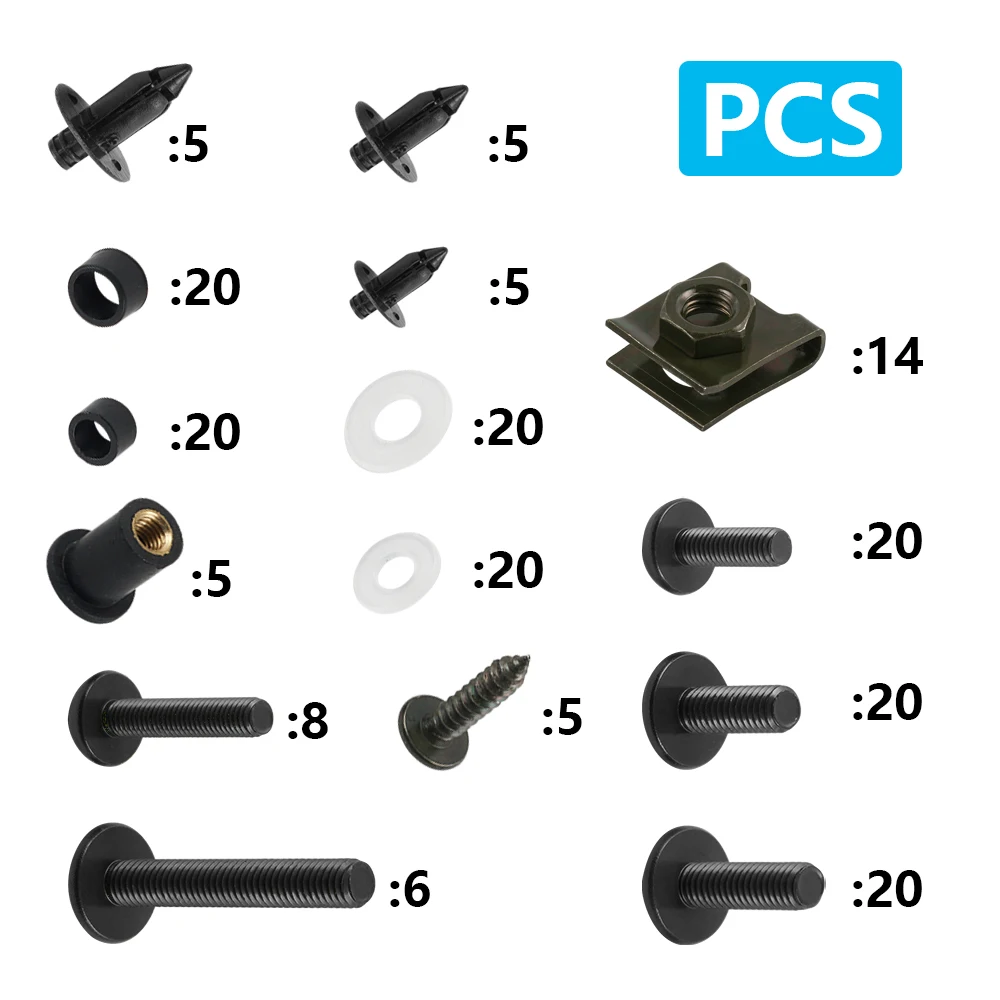 Посылка включает в себя: (с пластиковой коробкой)(* 74 болта и 116 аксессуаров) 190 штБолты M6- (6x40 мм) x 6 шт.Болты M6- (6x16 мм) x 20 шт.Болты M6- (6x20 мм) x 20 шт.Болты M5- (5x16 мм) x 20 шт.Болты M5- (5x25 мм) x 8 шт.Зажимы скорости x 14Крепежные винты x 5Гайка колодца х 5Нейлоновые шайбы для 6 мм x20Нейлоновые шайбы для 5 мм x20M6 пластиковая стойка x 20M5 пластиковая стойка x 20Обтекатели: M6x5, M8x5Шестигранный ключ: M5x1 M6x1
