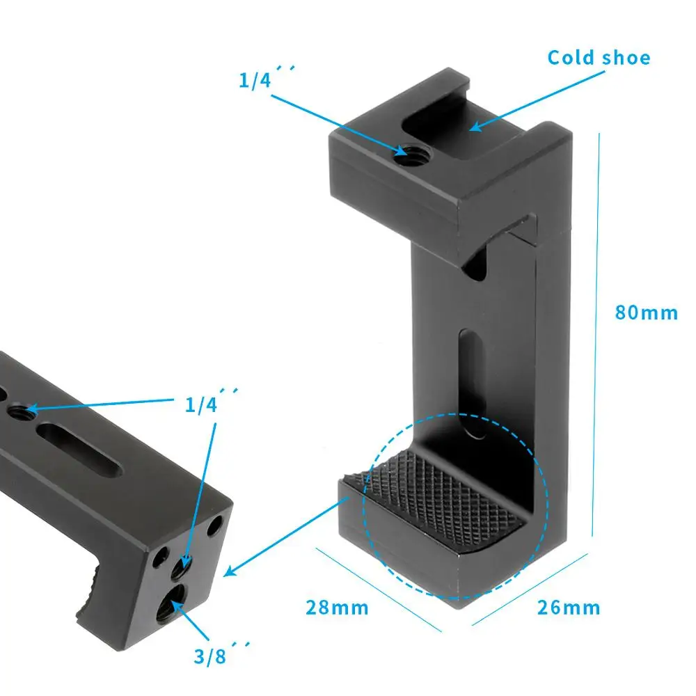 Бренд: BGNingМатериал: алюминиевый сплавЦвет: черныйТехнология поверхности алюминиевого сплава: анодированиеРазмер изделия: 80 мм * 28 мм * 26 ммВес изделия/г: 70 гКоличество: мобильный телефон держатель * 1Особенности:1. CNC обработка авиационного алюминиевого сплава, прочный и прочный;2. Высококлассная анодированная пескоструйная обработка и окисление, удобная на ощупь, и цвет прочный и не выцветает;3. Максимальная ширина зажима 87 мм;4. Есть 1/4 "винтовые отверстия и 3/8" винтовые отверстия внизу;5. Сверху ЕСТЬ ШТЫК холодной обуви.